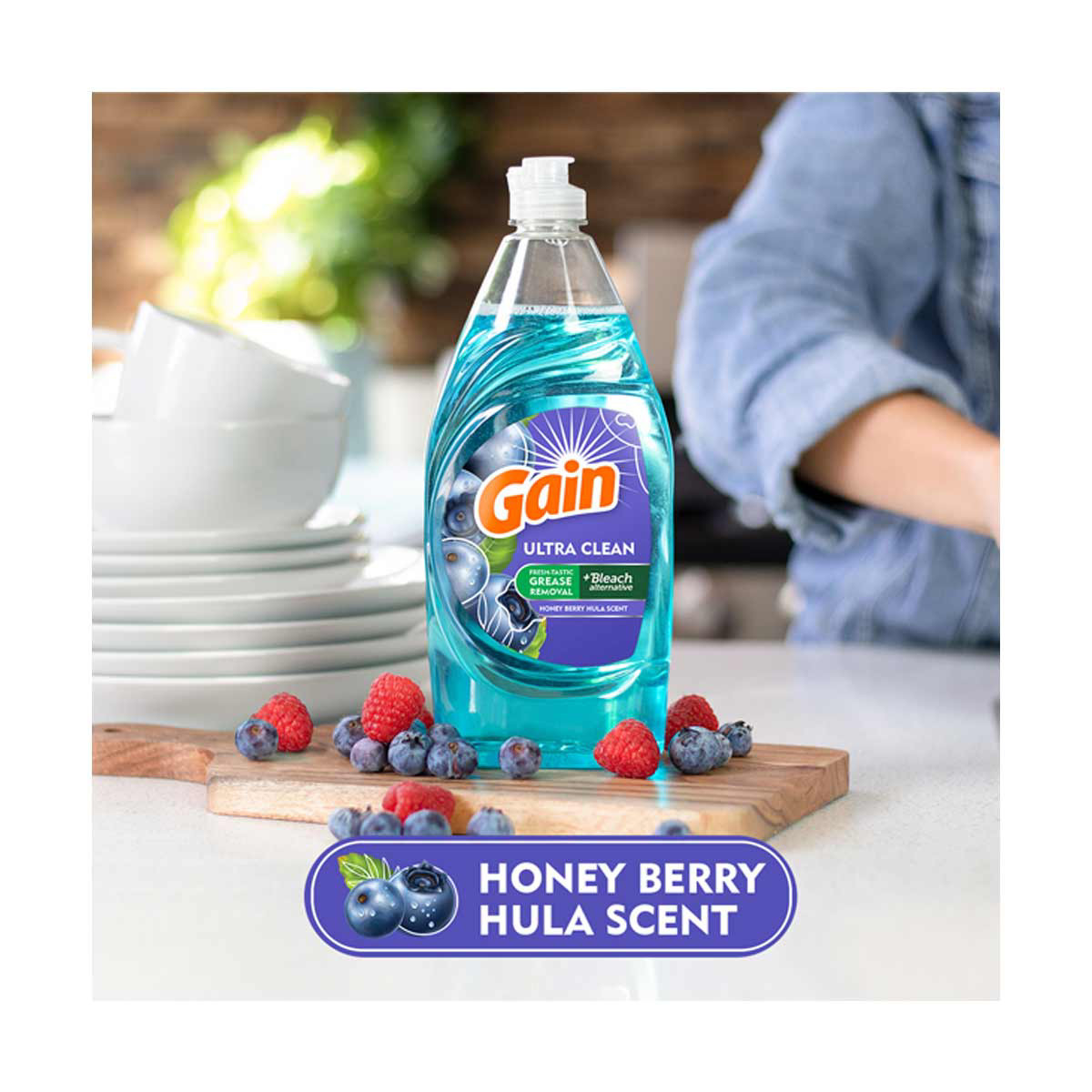 • Gain Ultra + Bleach Alternative Dish Soap, Dishwashing Liquid, Honey Berry Hula, 21.6 Fl Oz