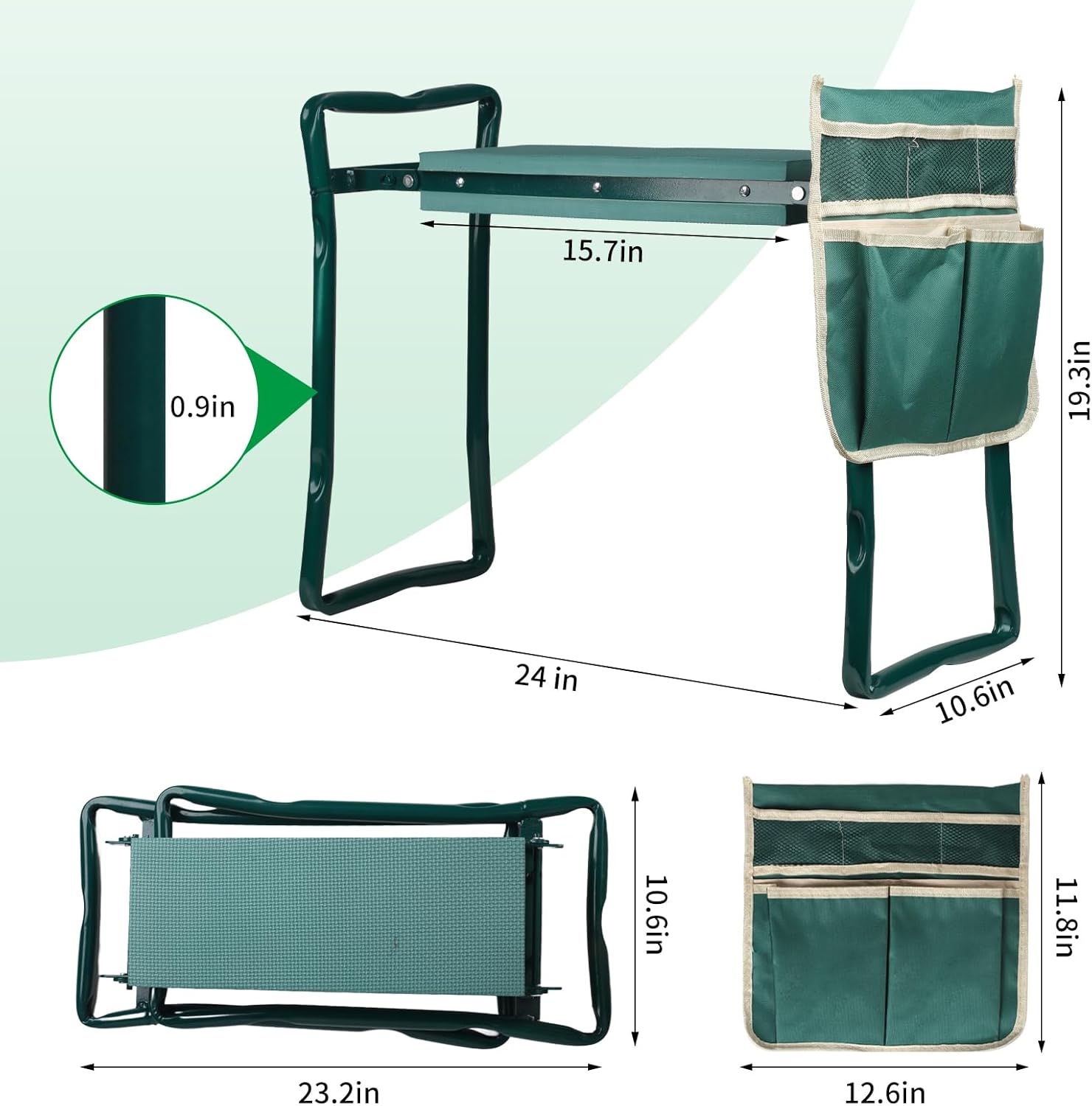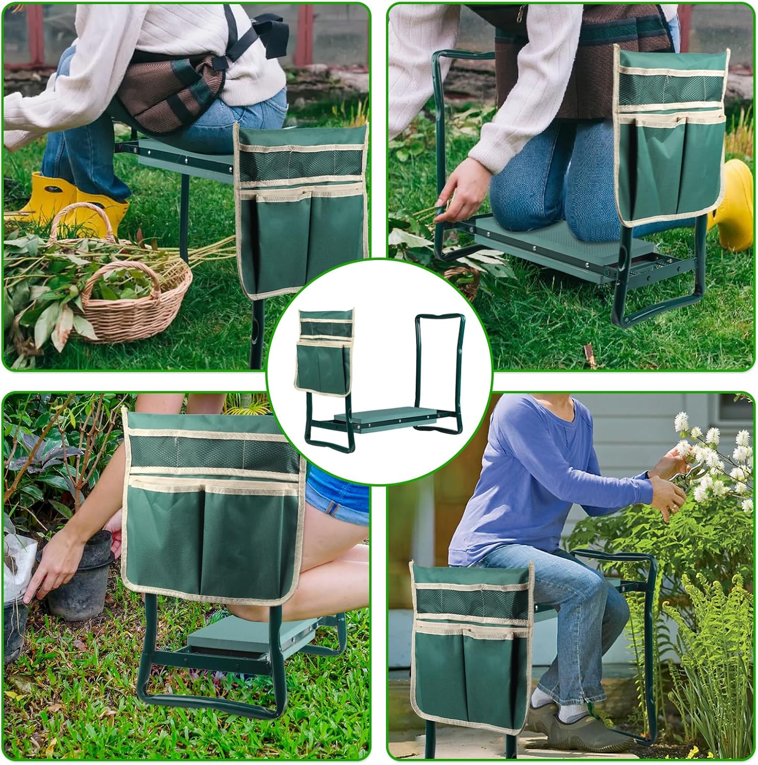 - 【Convenient Tool Bag】Our garden seat is equipped with one large detachable tool pouche that has 4 pockets (two big pockets and two small pockets) and can be hung beside the seat, it is very convenient to keep your tools outdoors. And you can also take it down anytime, it's easy to clean.