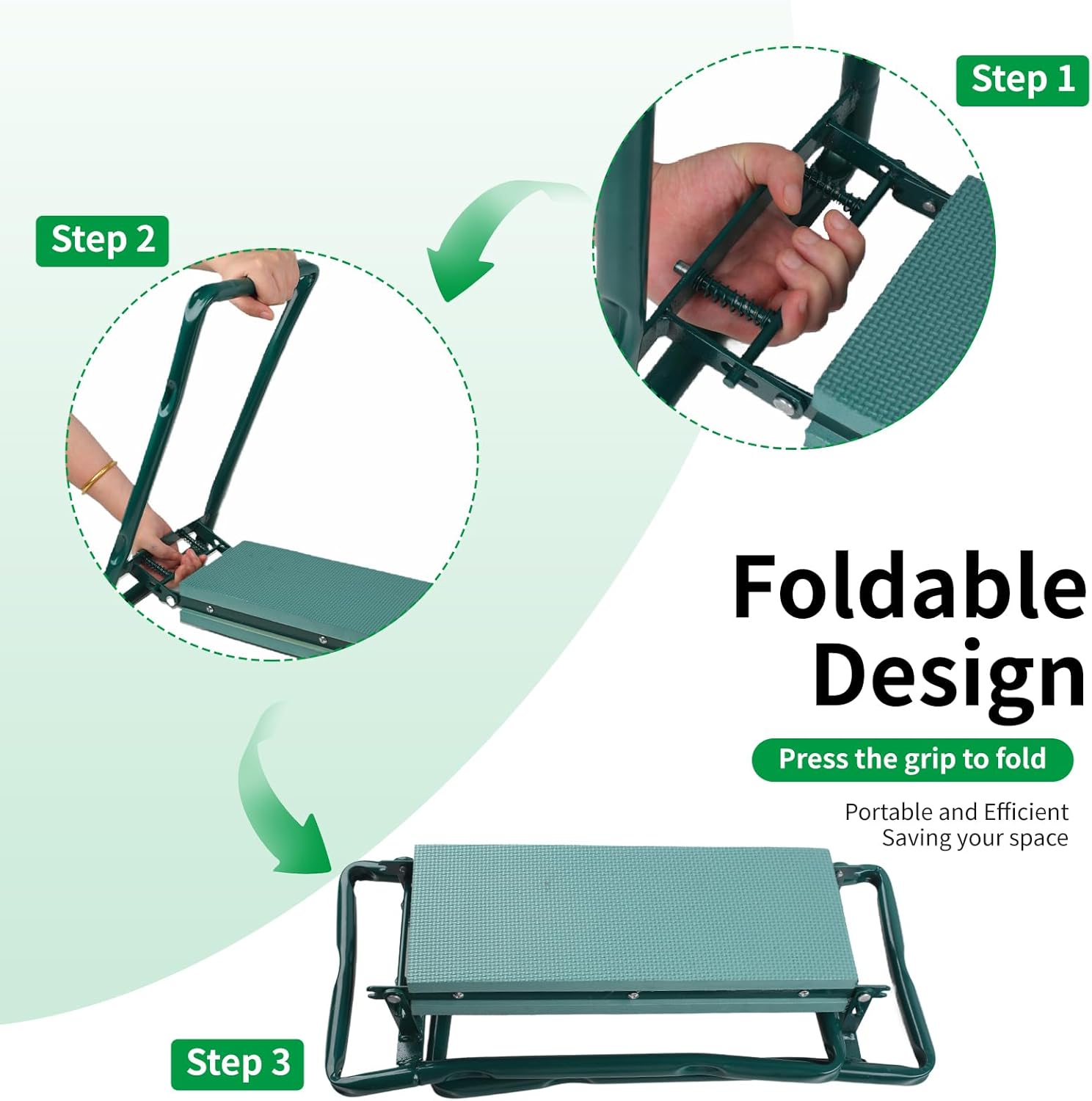 - 【Sturdy & Durable】 Our garden stool and kneeler uses premium EVA foam cushion, the foam cushion can make you more comfortable and slip-resistant after a long time kneeling and can protect your knees. Our gardening stool is framed with high-quality steel materials, it is durable and solid enough to hold up to 330 lbs of weight, meeting your long-term needs!