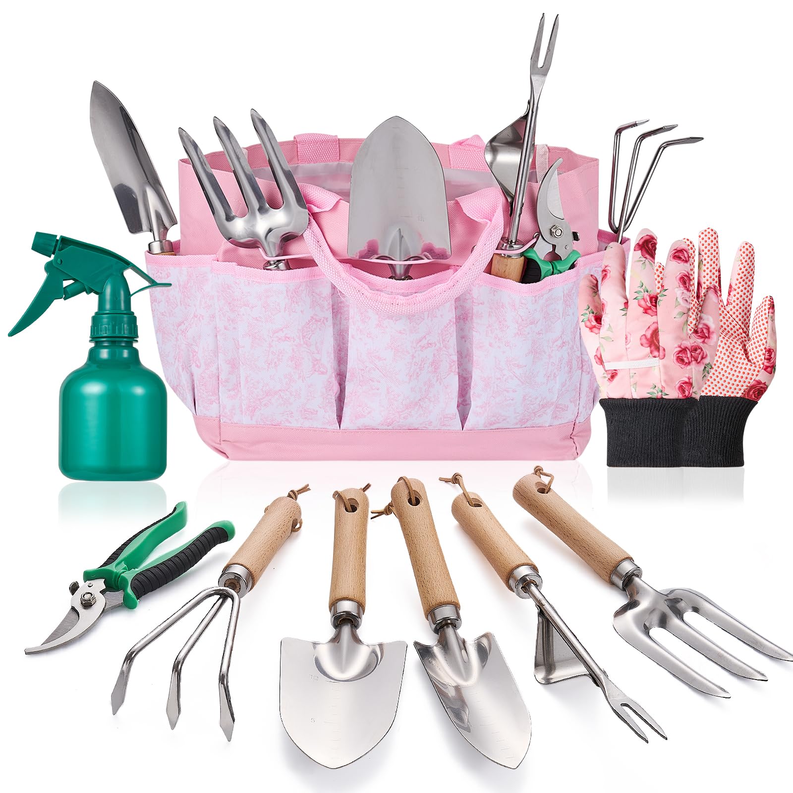 - 9-Piece All-in-One Gardening Set: Includes 8 essential gardening hand tools (weeder, hand rake, transplanter, trowel, pruner, gloves, spray bottle, and more) and a stylish tote bag. Whether you're planting, weeding, or transplanting, this garden tool set has everything you need to tackle any gardening tools task.