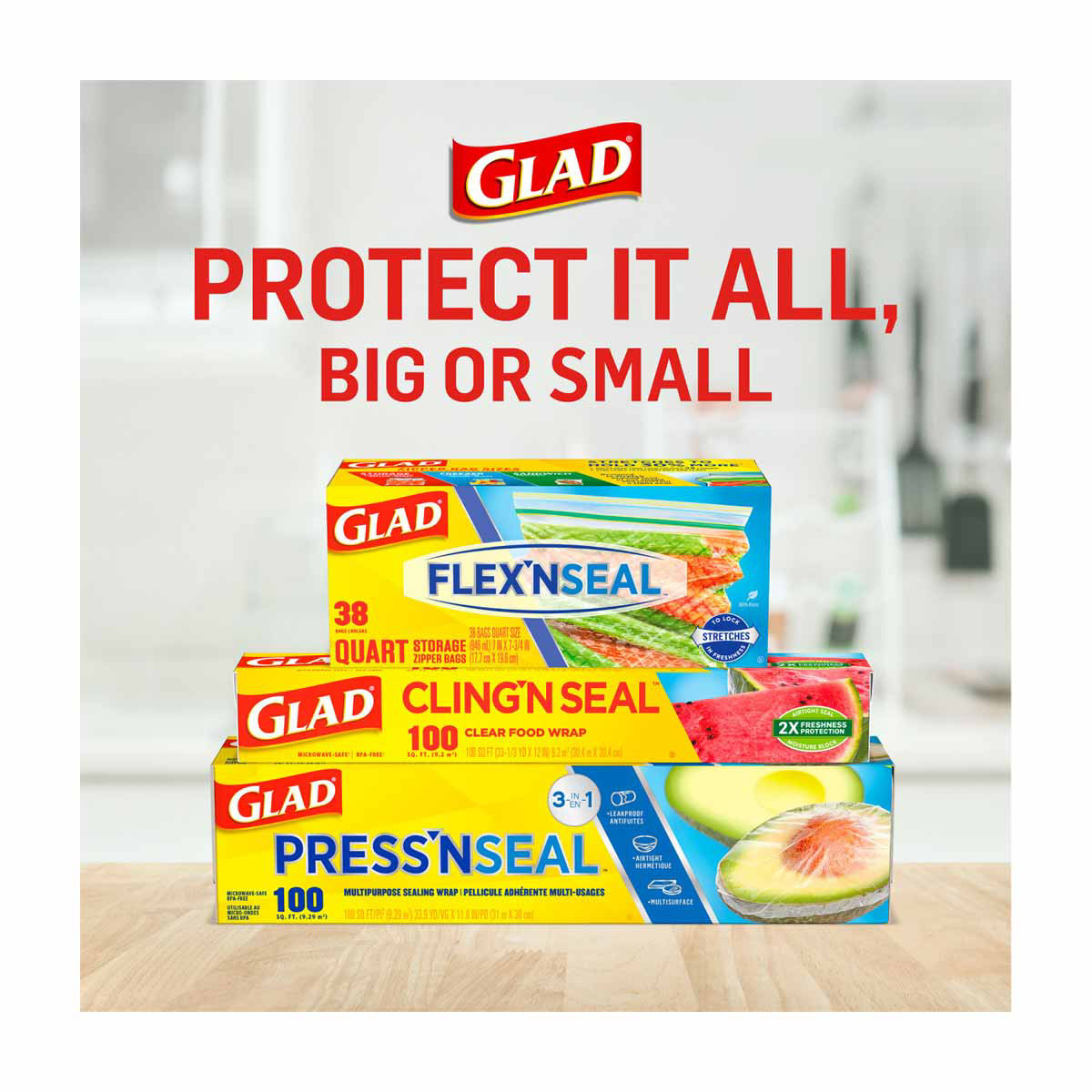 - GLAD® CLING ‘N SEAL™ WRAP: Extend foods' freshness with 2X Freshness Protection with an airtight seal and moisture block technology; Packaging may vary