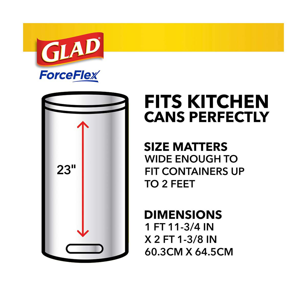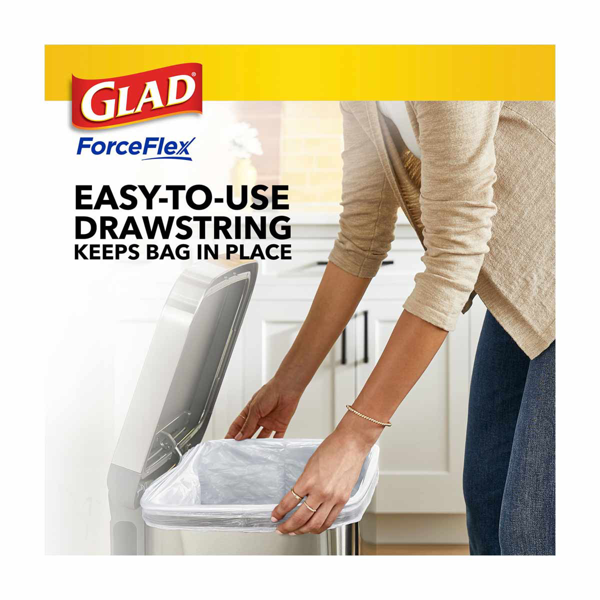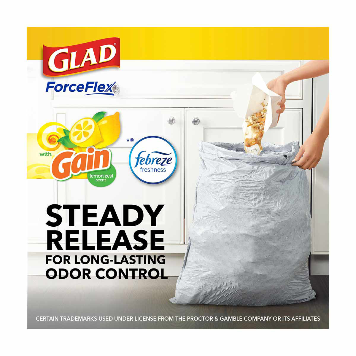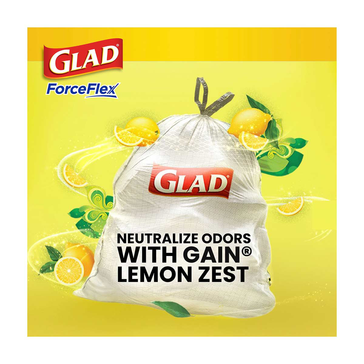 - TALL KITCHEN GARBAGE BAGS: Twenty-two (22) 13-gallon Glad ForceFlex Drawstring Tall Kitchen Trash Bags in Gain Lemon Zest Scent With Febreze Freshness