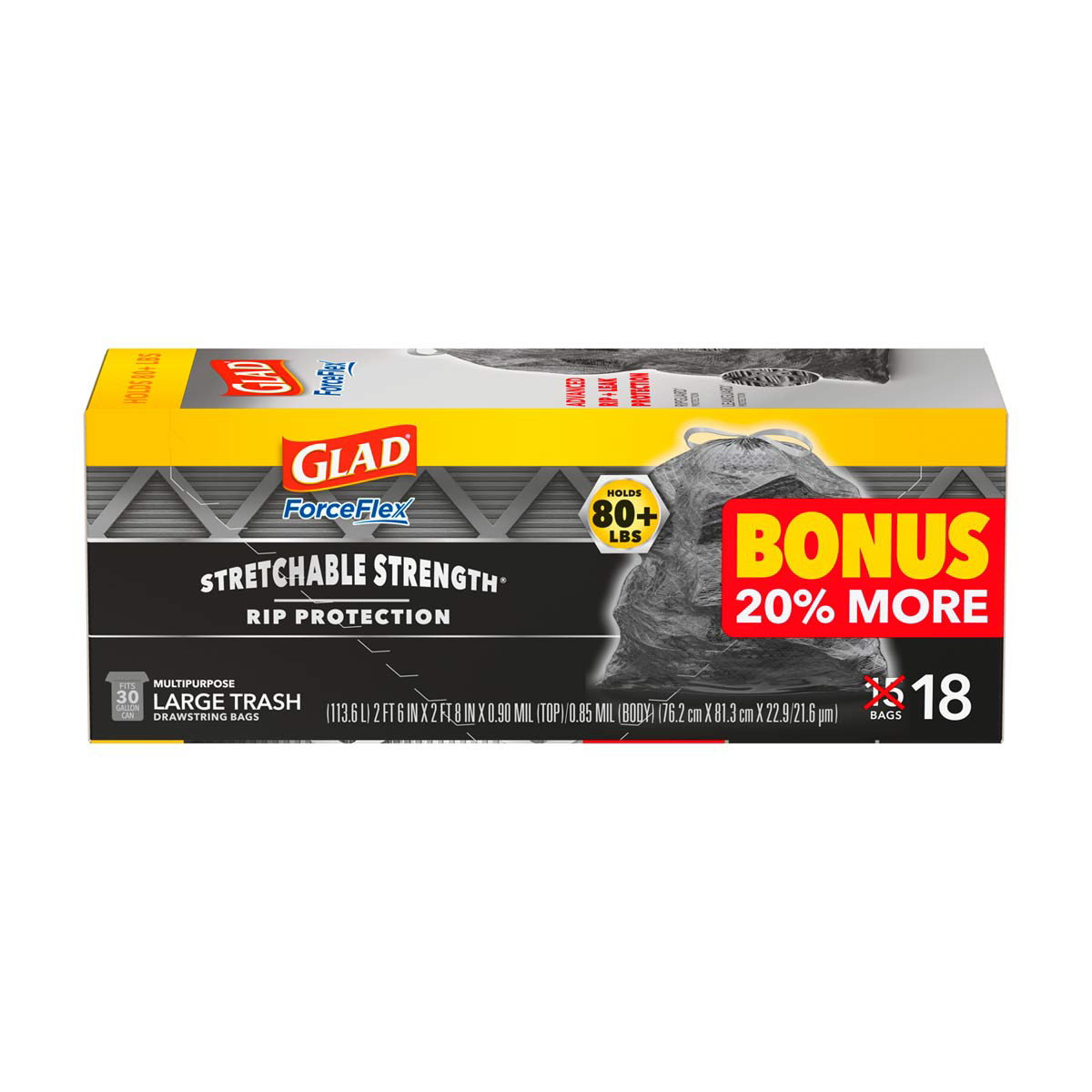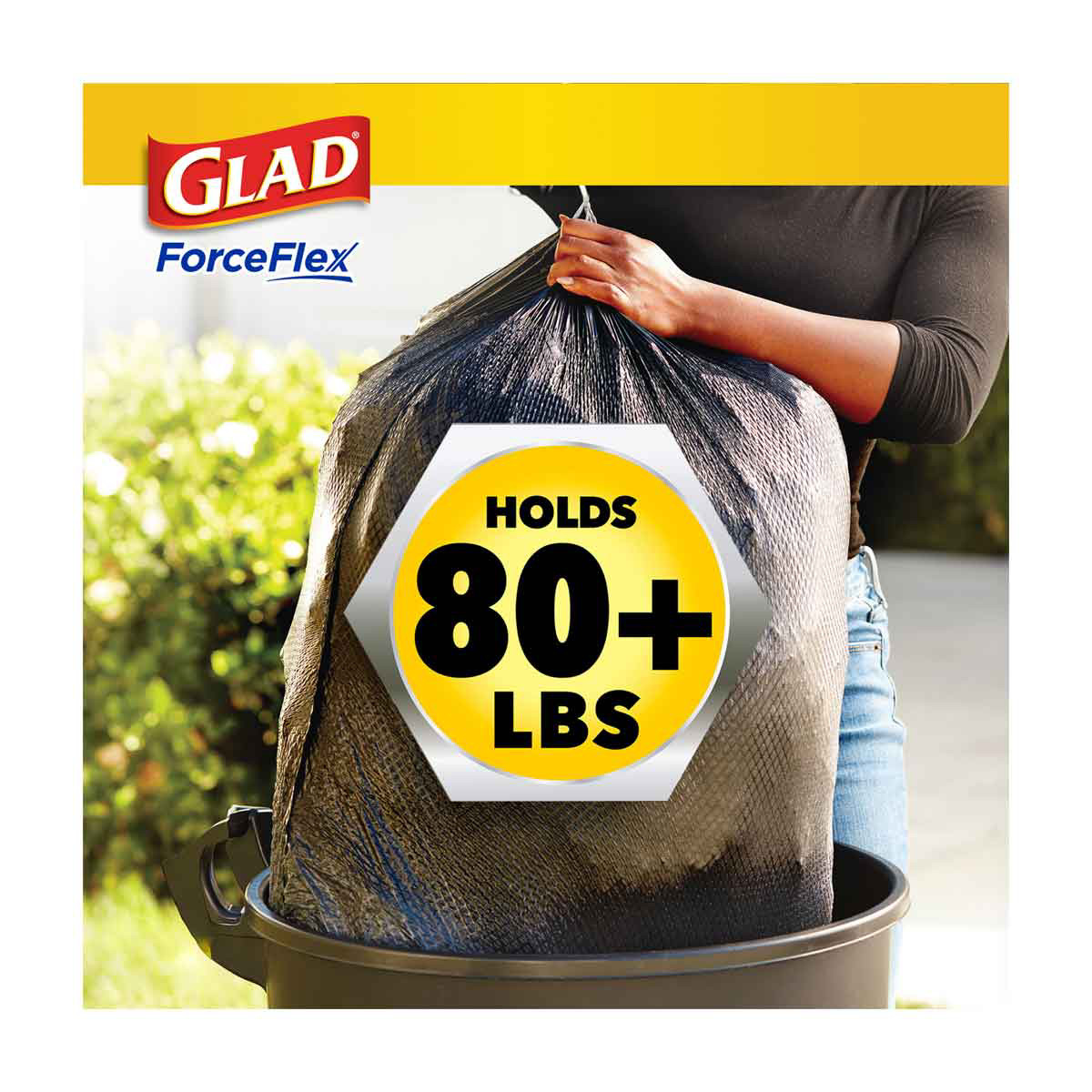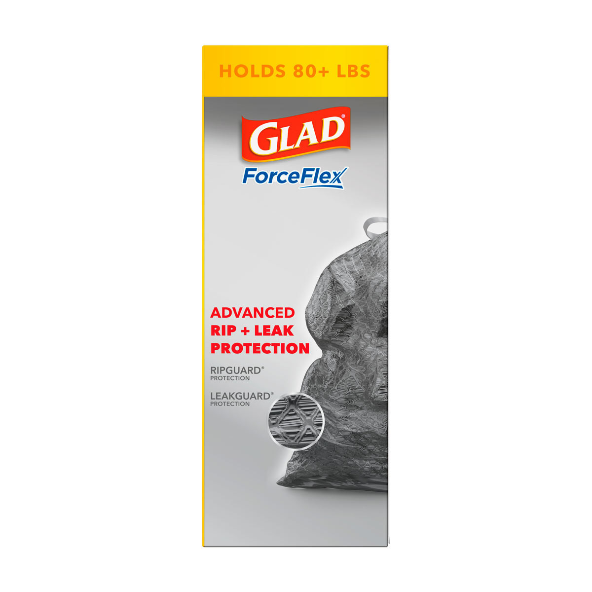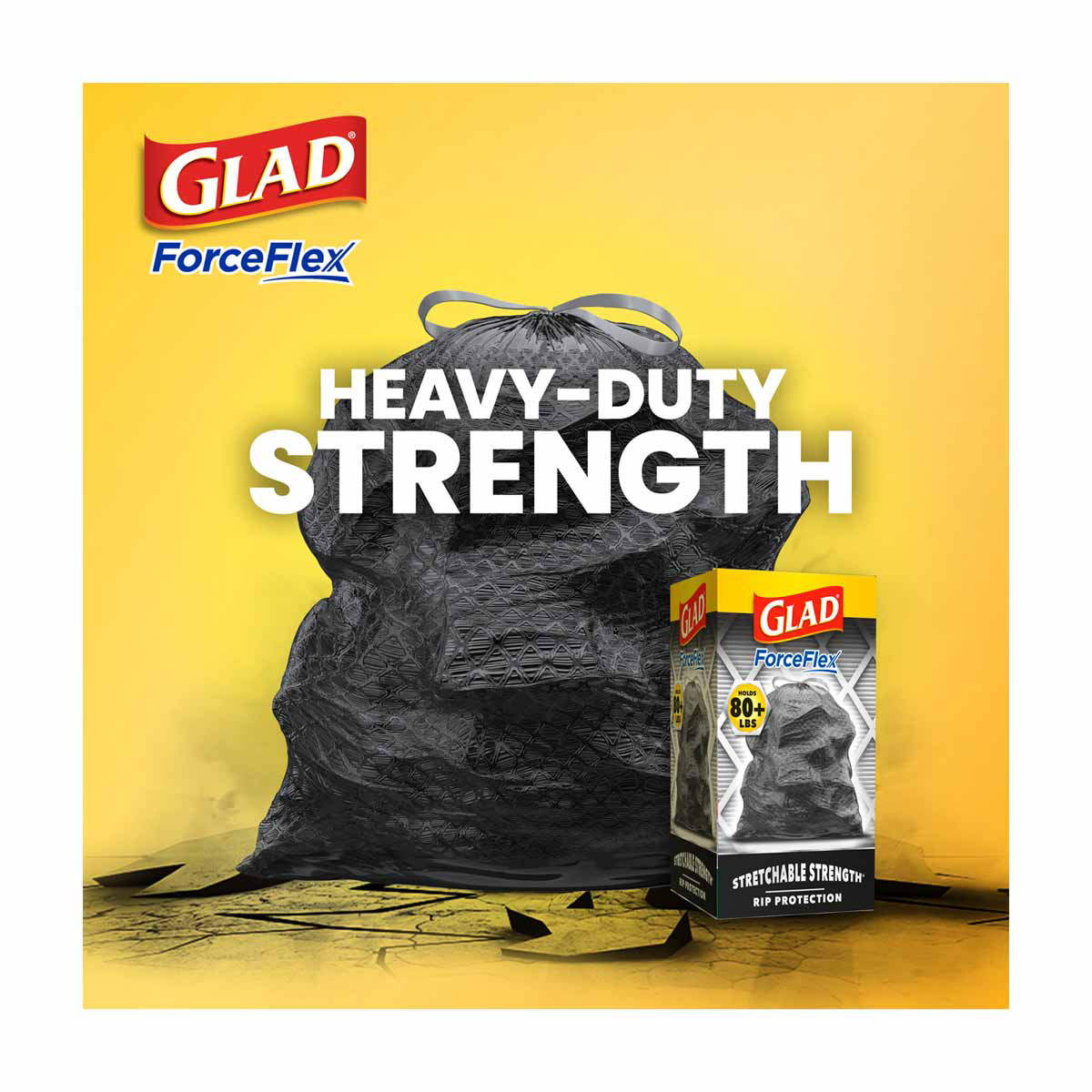 - FORCEFLEX TRASH BAGS: Glad®’s trusted ForceFlex technology allows the bag to stretch and expand over heavy loads with sharp edges, delivering durable strength; pack may vary