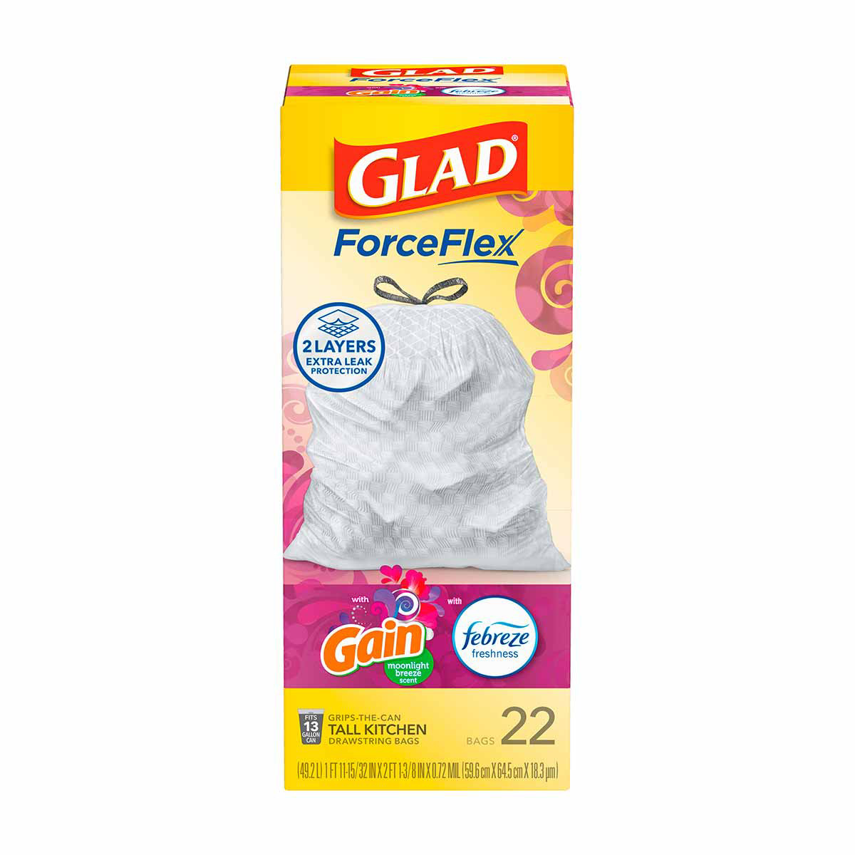 - FORCEFLEX STRENGTH: Glad’s trusted ForceFlex technology allows the bag to stretch and expand over heavy loads with sharp edges, delivering durable strength; packaging may vary
