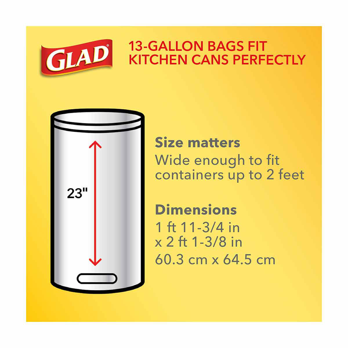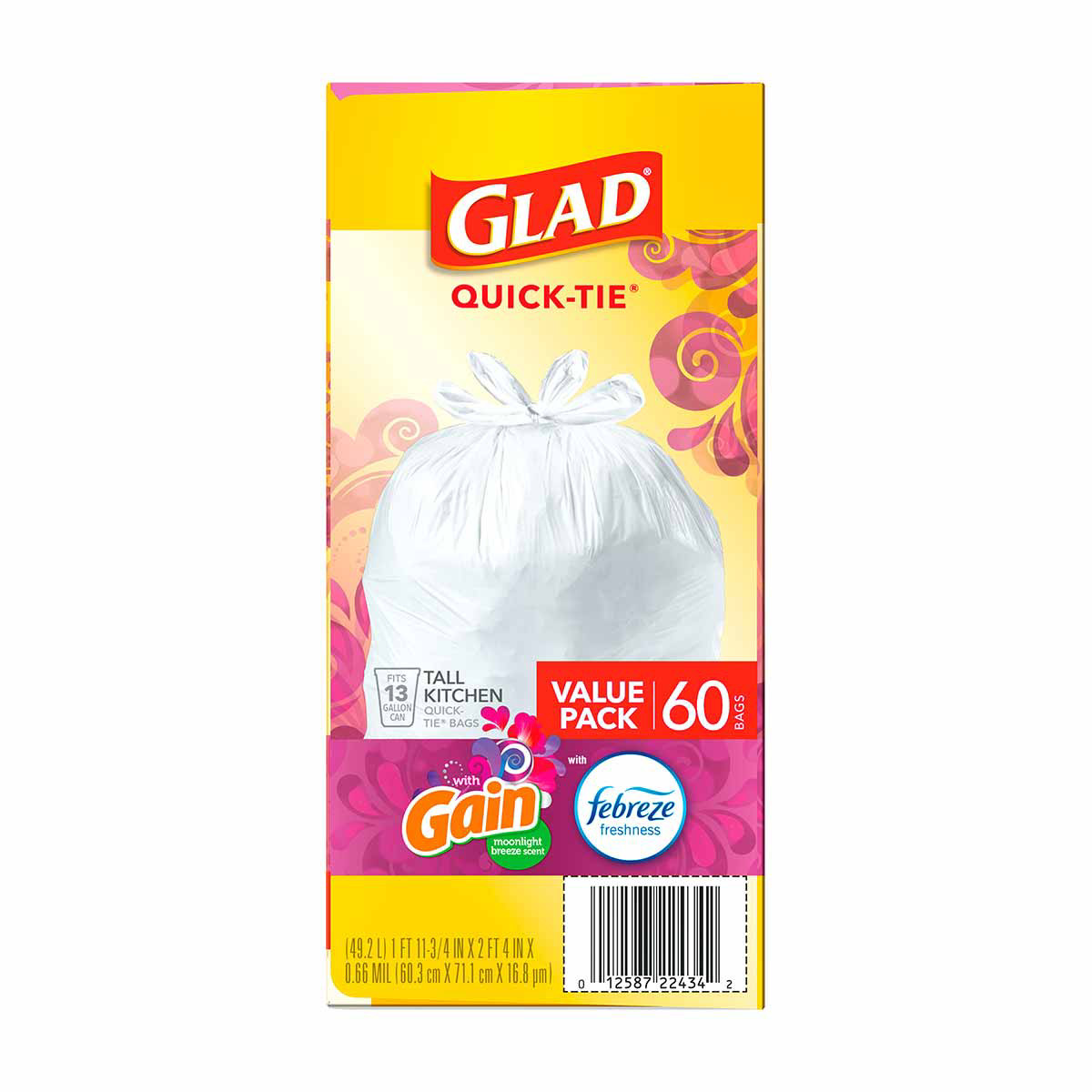 - TALL TRASH BAGS: Sixty (60) 13-gallon Glad Quick-Tie Tall Kitchen Trash Bags With Gain Moonlight Breeze Scent With Febreze Freshness provide strength plus odor control