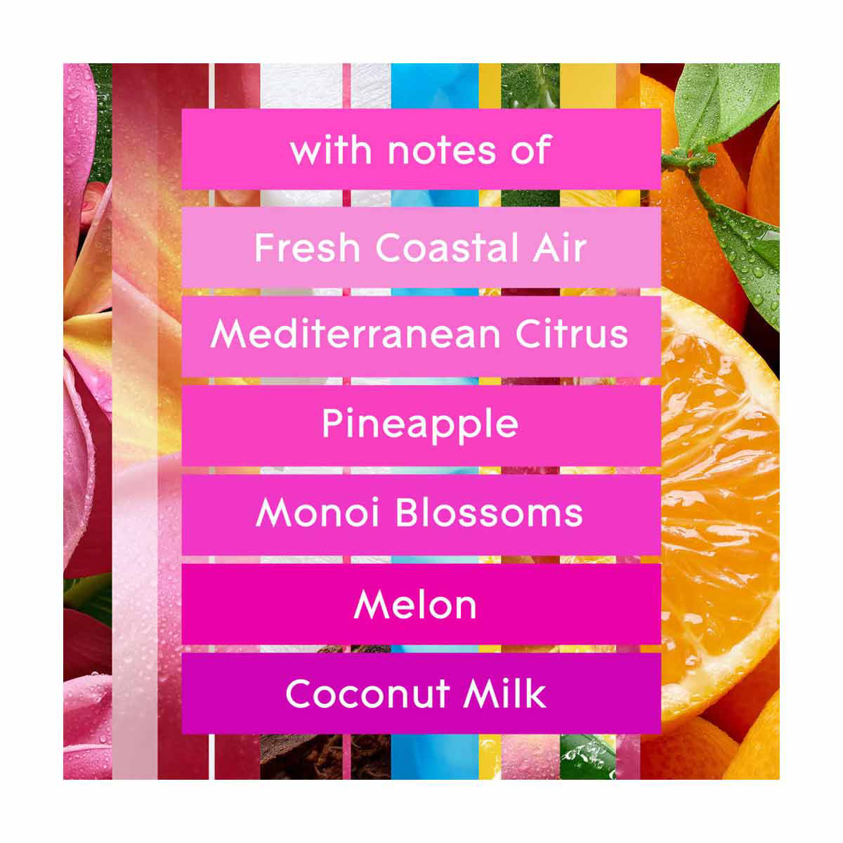 - Surround yourself with scent and a soft glow with the Glade Coastal Sunshine Citrus & Exotic Tropical Blossom 2-in-1 candle with notes of Mediterranean Citrus, Fresh Coastal Air, and Pineapple artfully paired with Monoi Blossoms, Melon and Coconut Milk