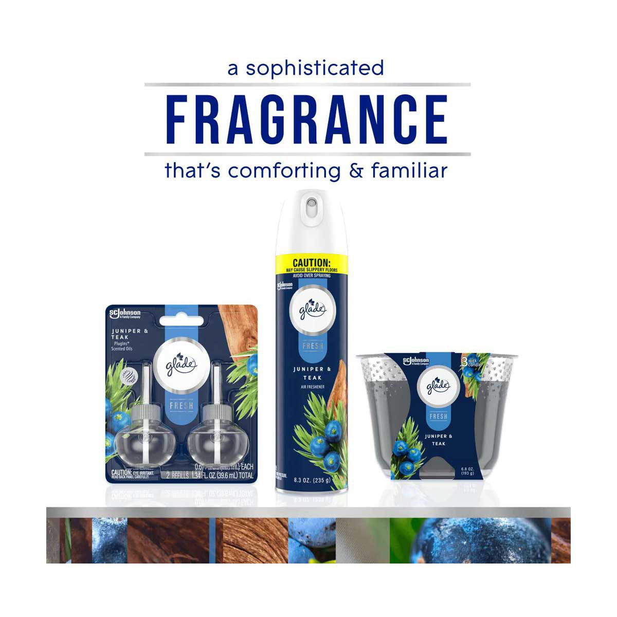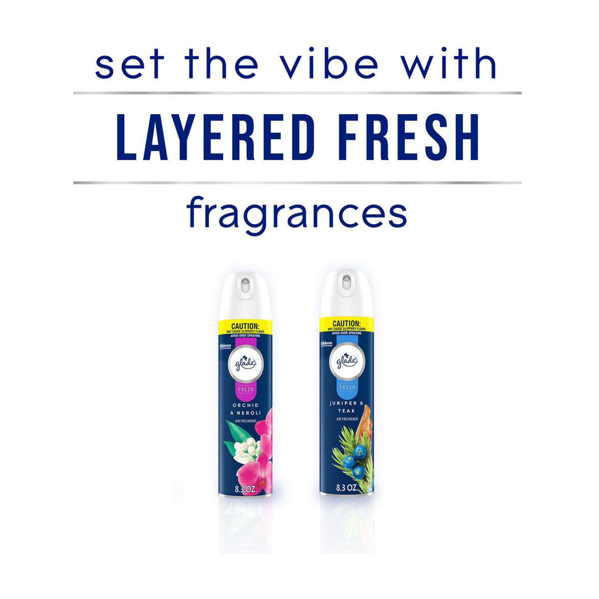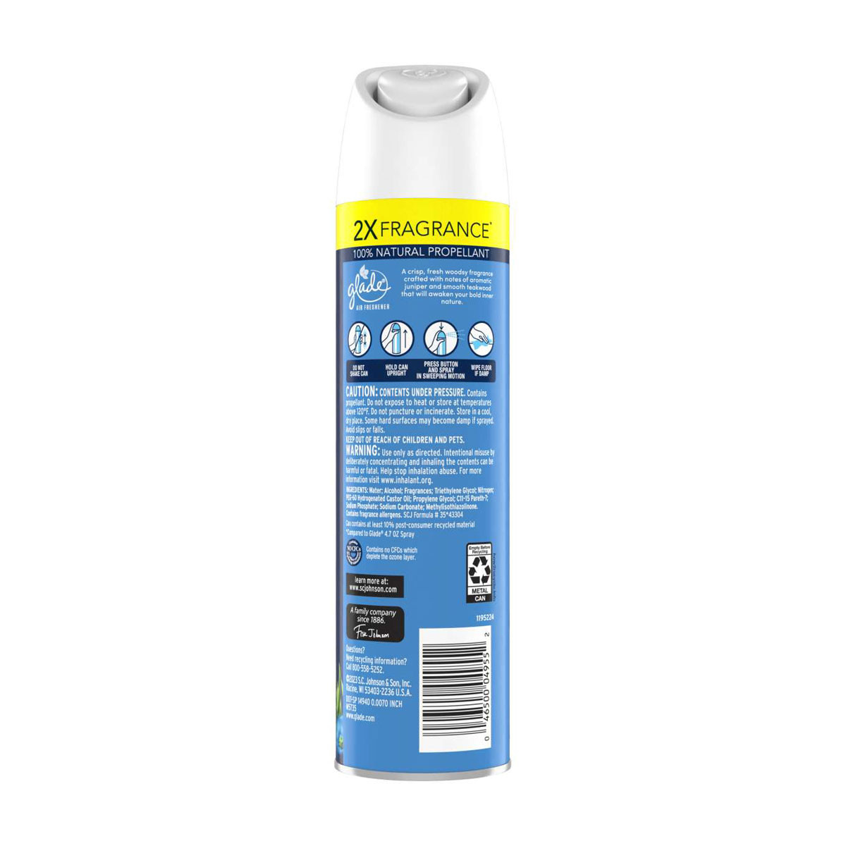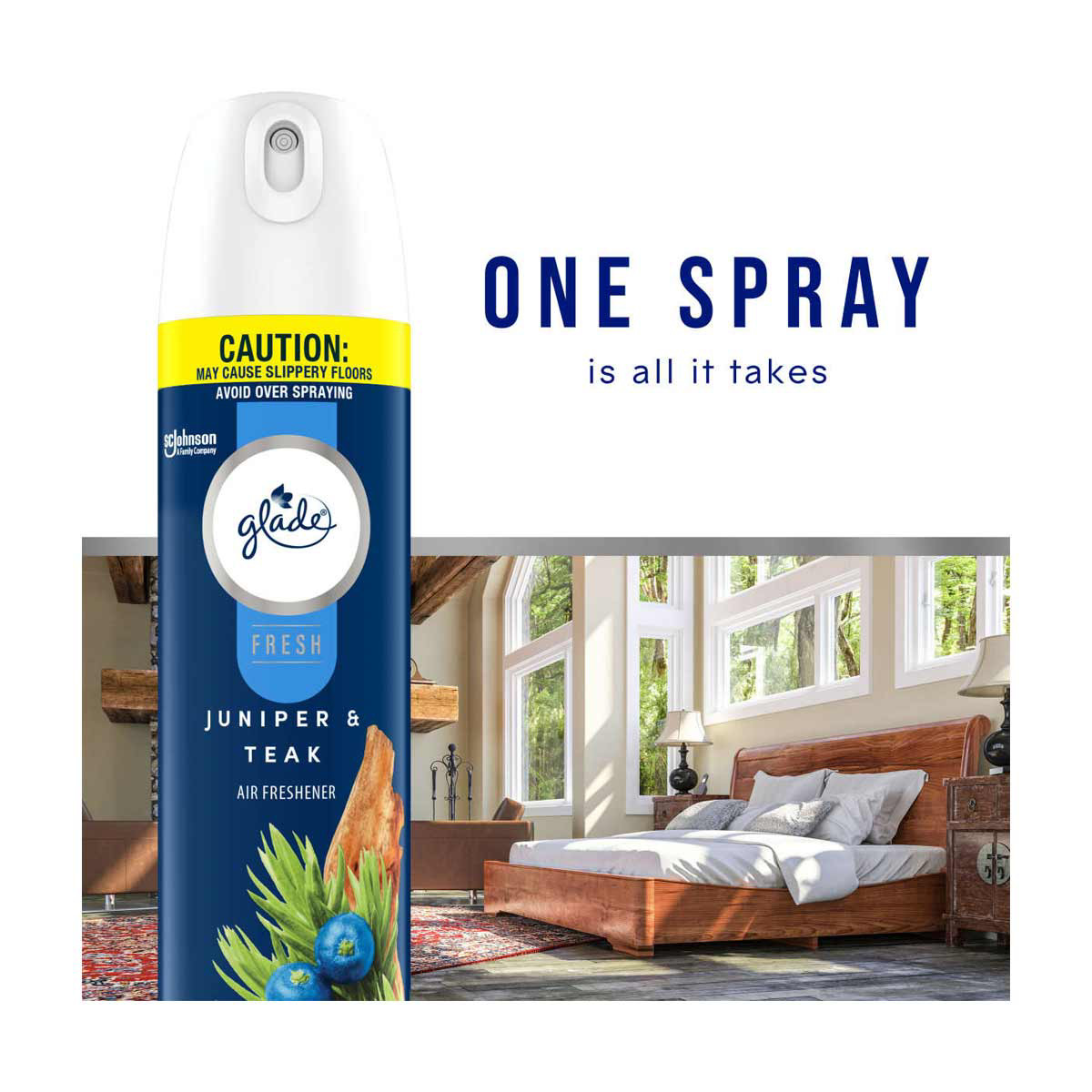 - Glade aerosol spray with fragrances infused with tanned teak, fiery cloves and aromatic juniper