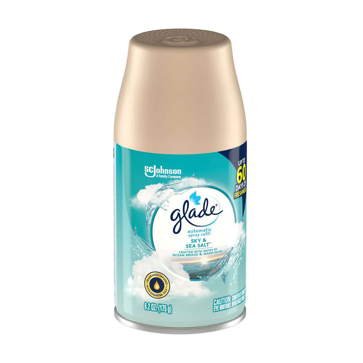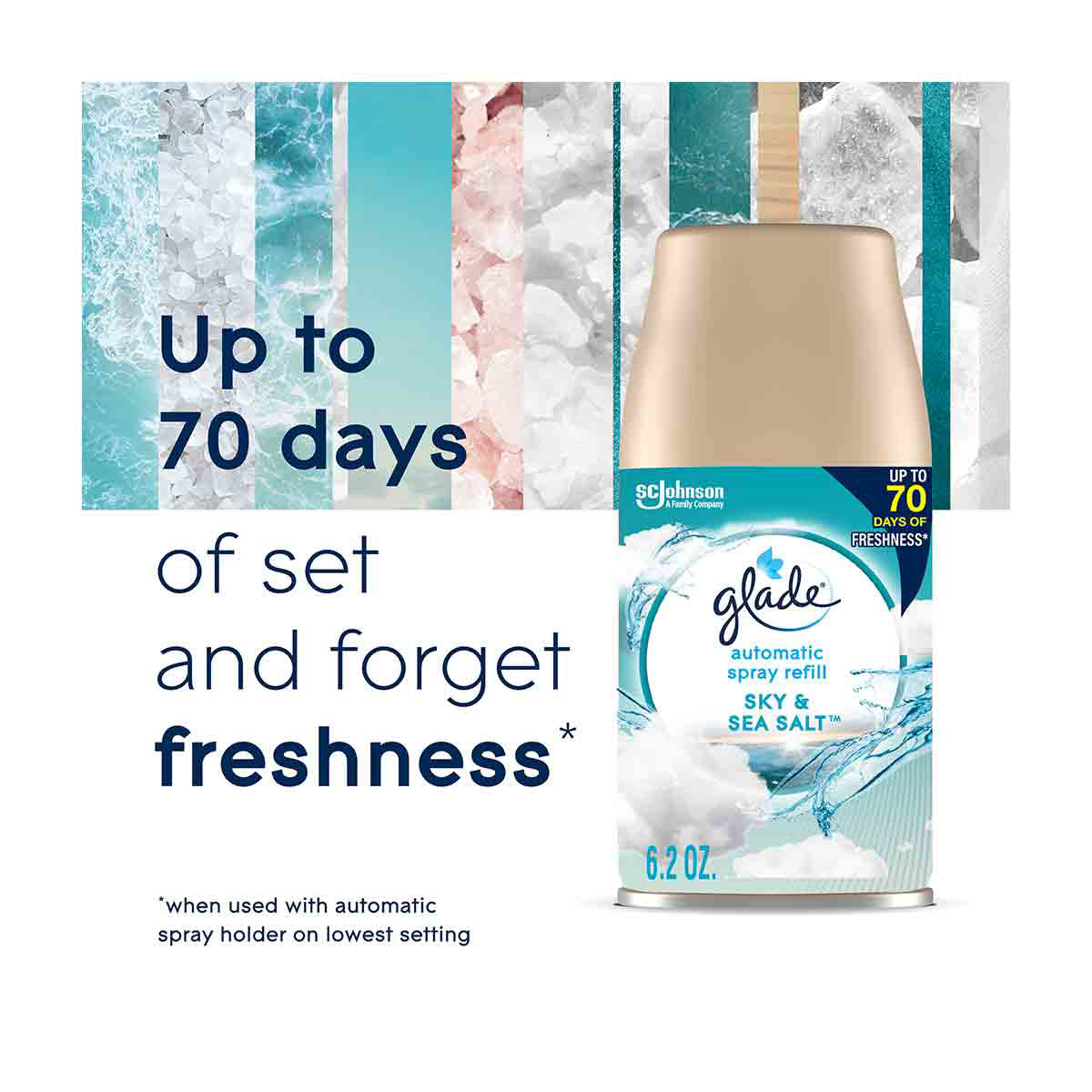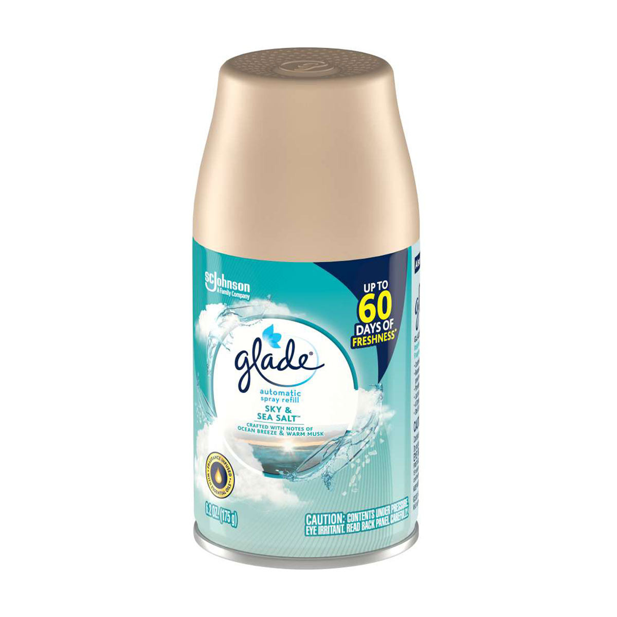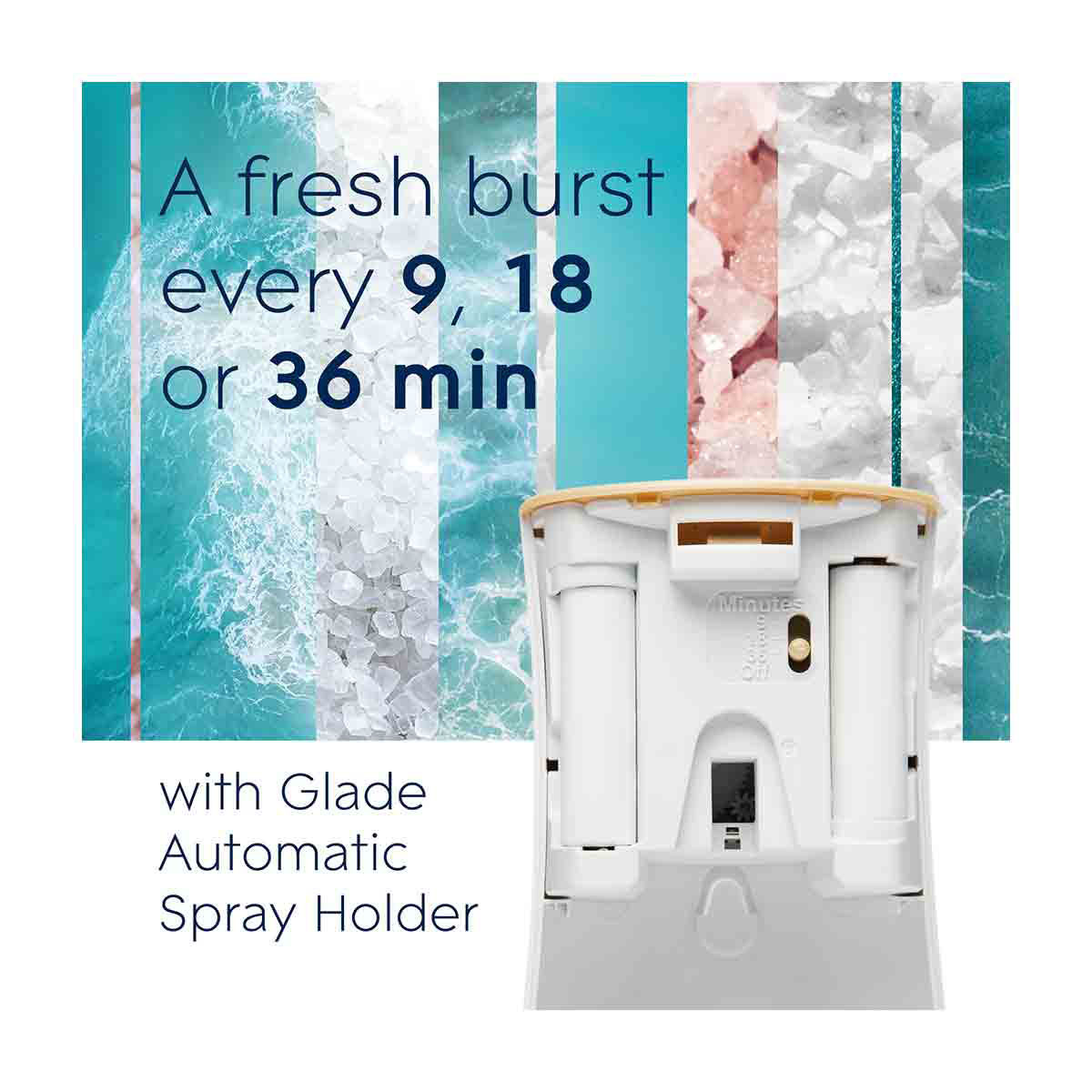 - Free your mind with Glade automatic spray, with notes of ocean breeze, sea salt and driftwood