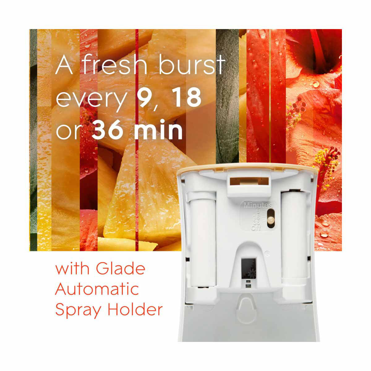 - Enjoy a fresh burst of tropical scent every 9, 18 or 36 min for a timed fragrance release