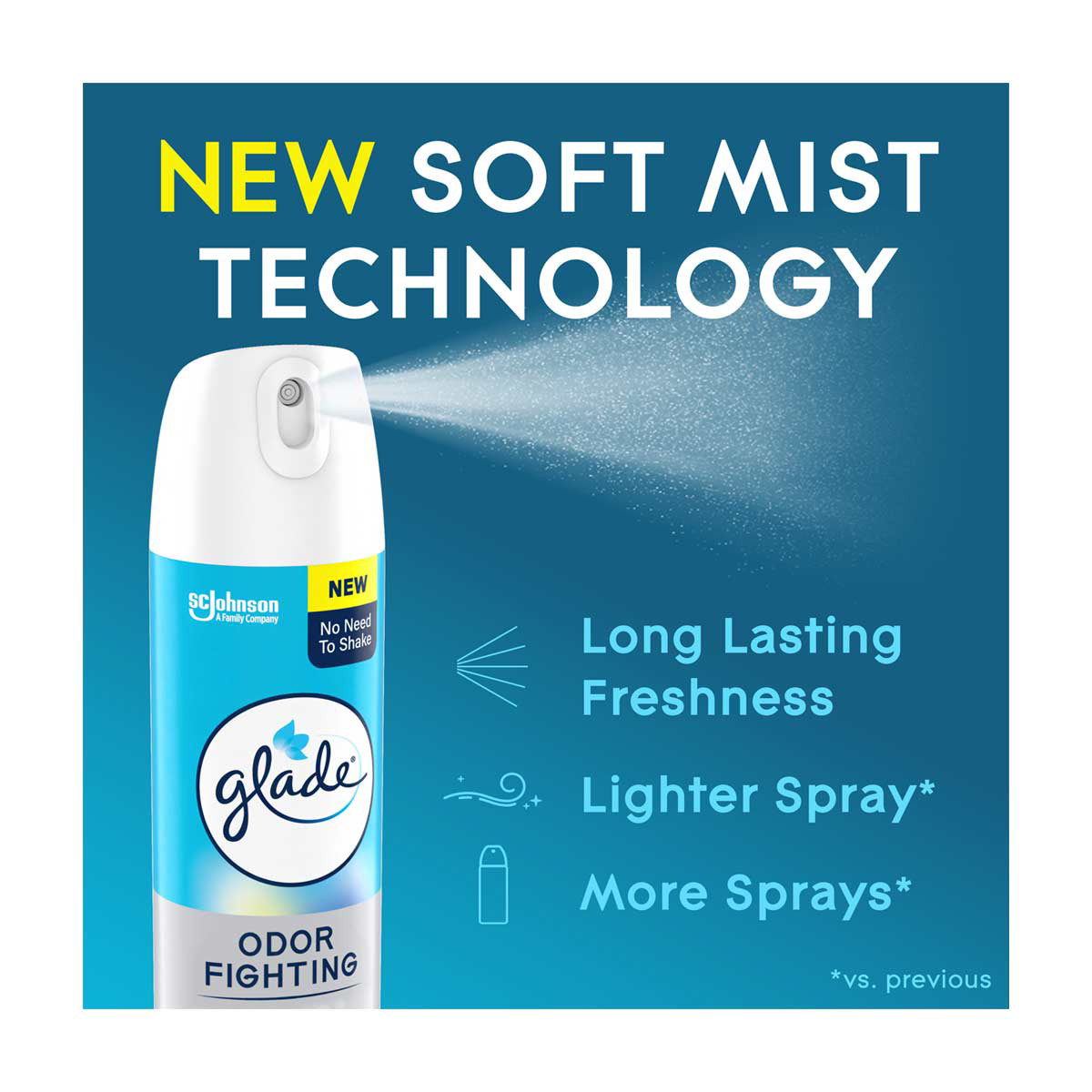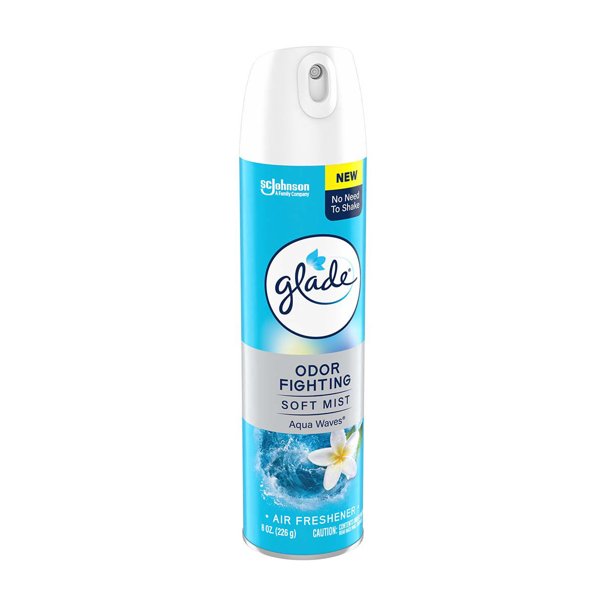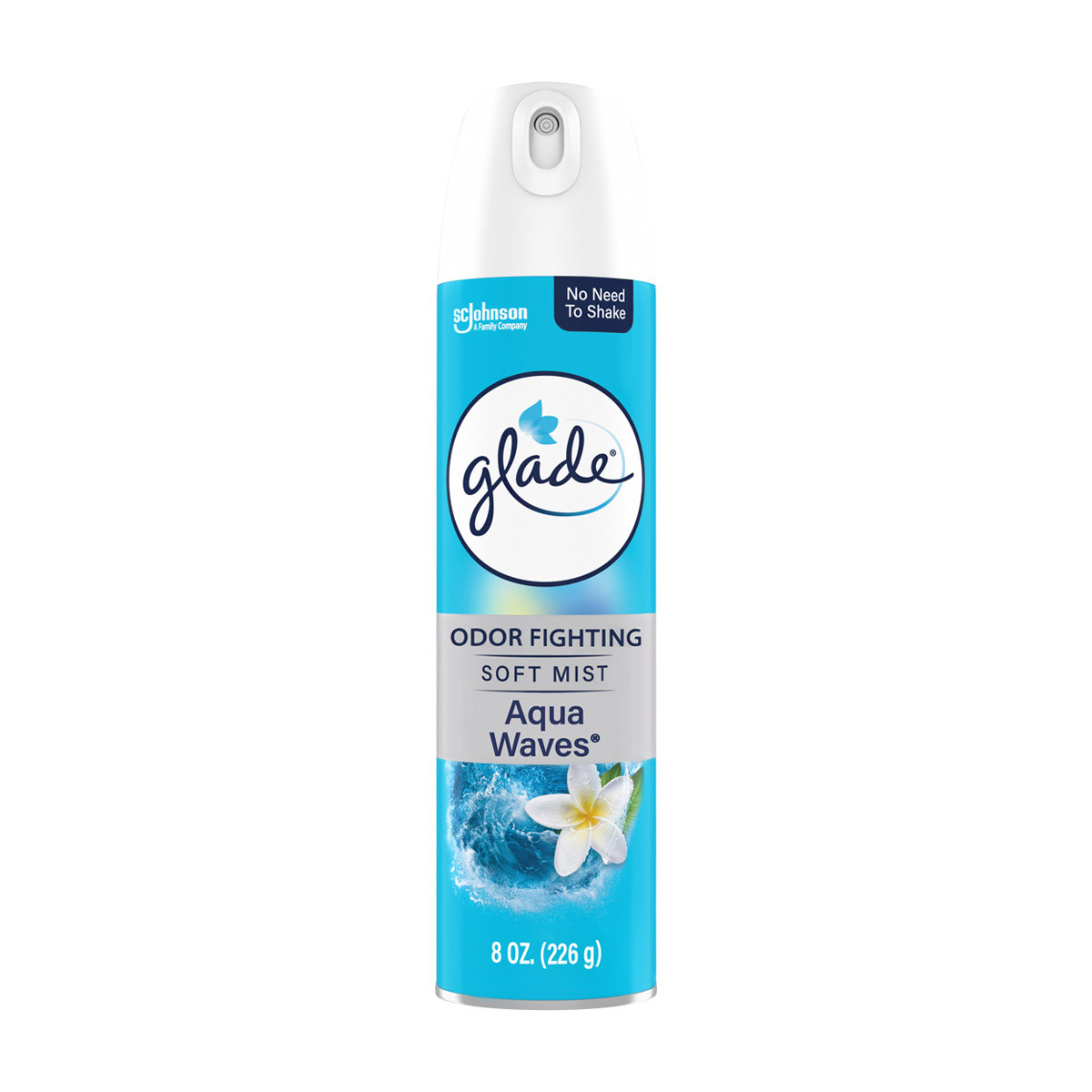 - New Glade Soft Mist fights odors, delivers long lasting freshness, and leaves behind a beautiful Aqua Waves scent