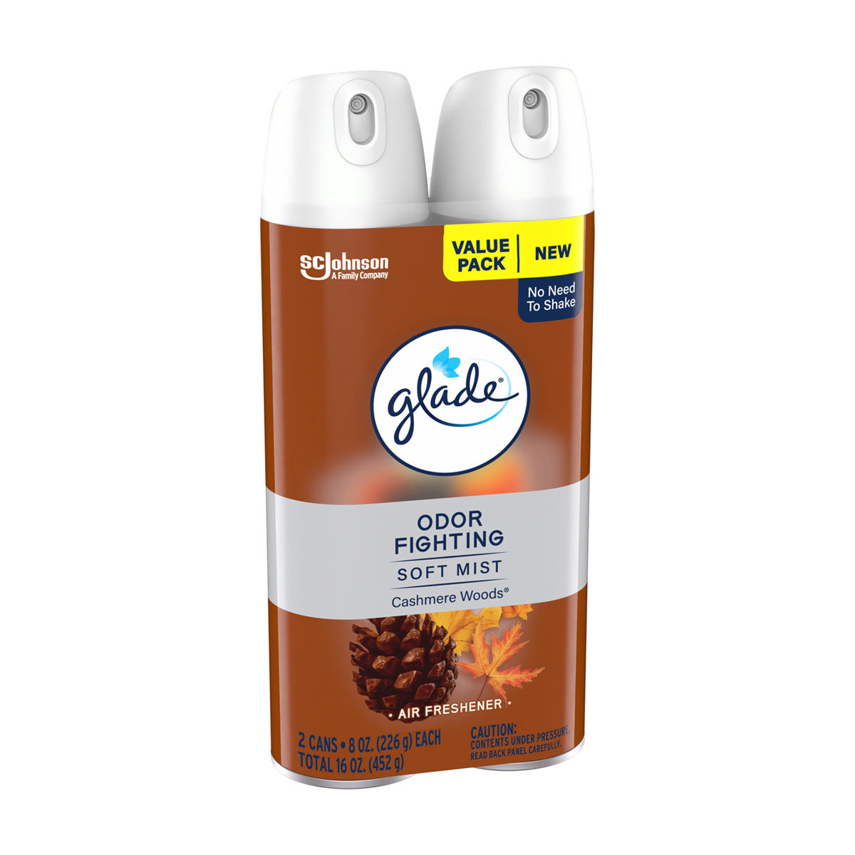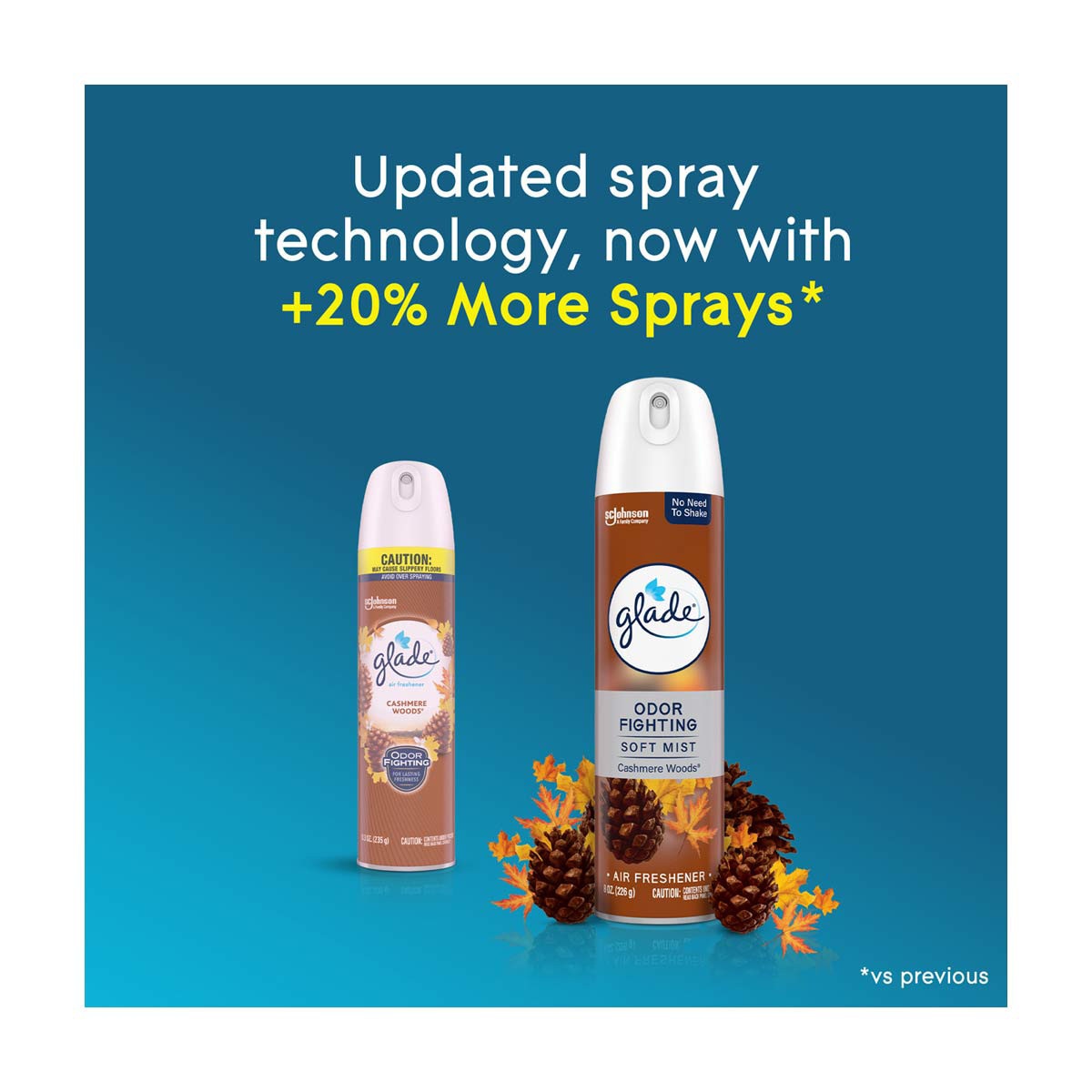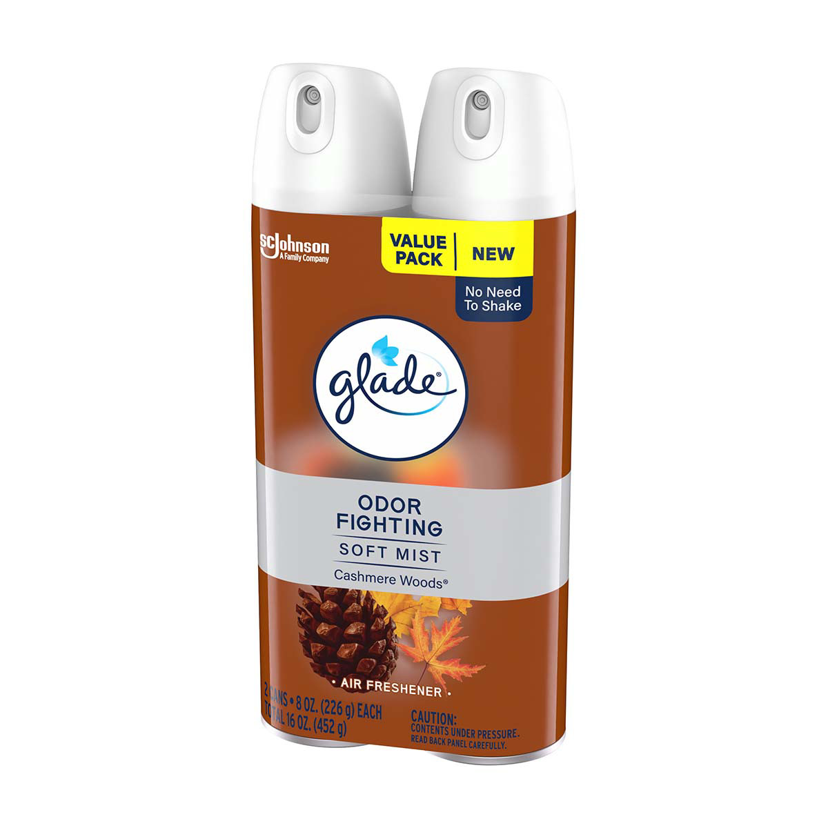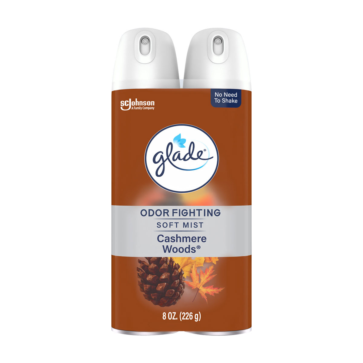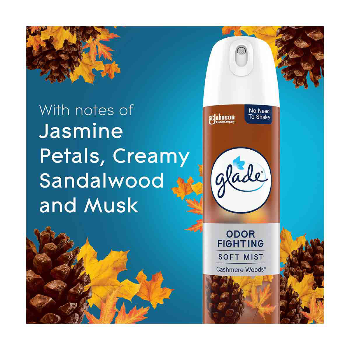 - New Glade Soft Mist fights odors, delivers long lasting freshness, and leaves behind a beautiful Cashmere Woods scent