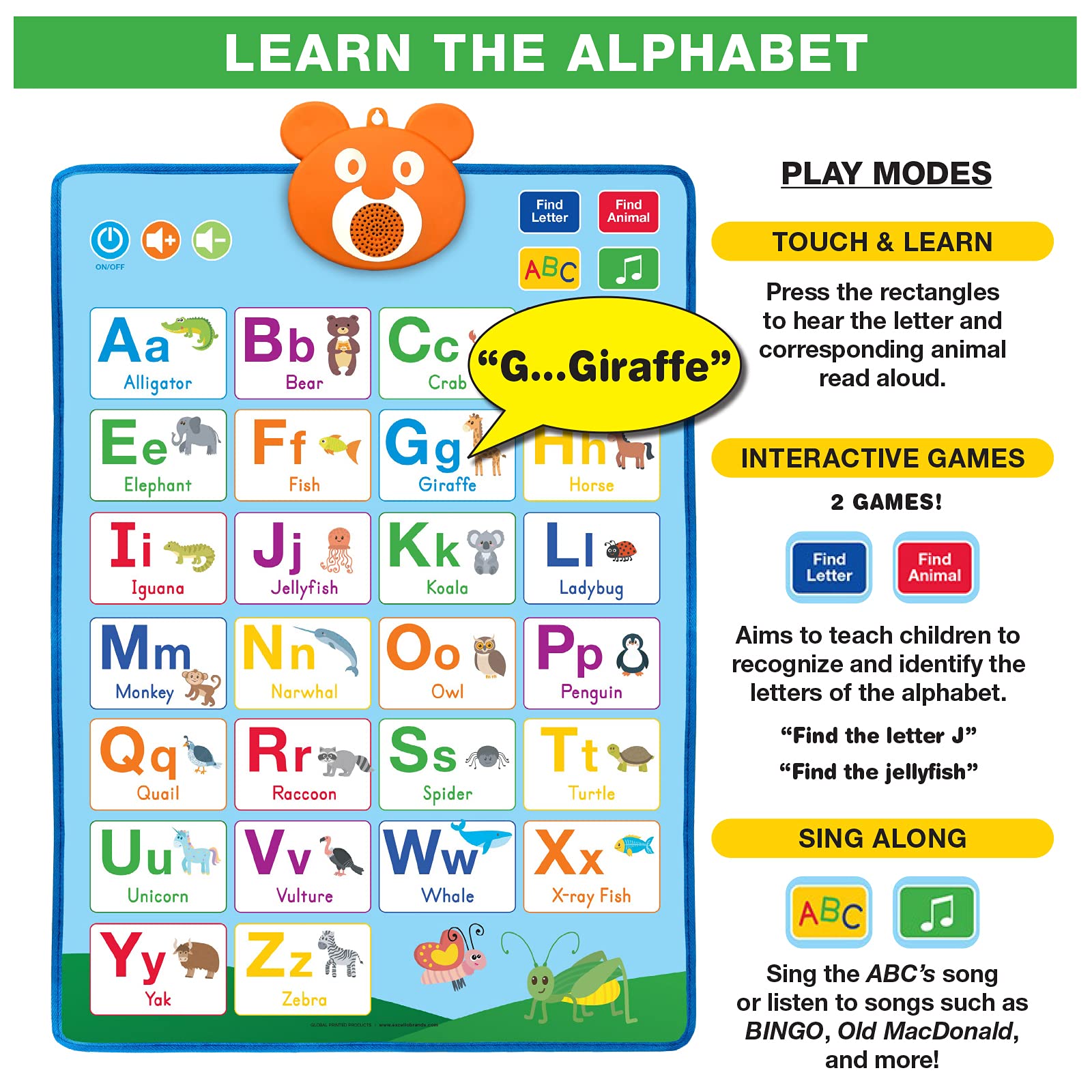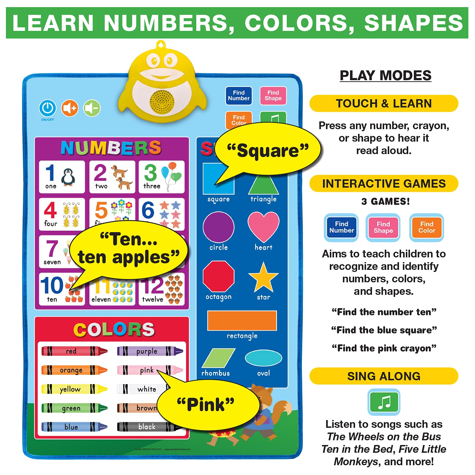 - TWO POSTER SET - This set includes two electronic learning posters. The Letters and Animals Poster includes two games, the Numbers and Colors poster comes with three games! Sing along with The Wheels on the Bus, Five Little Monkeys, Old Macdonald, and more!