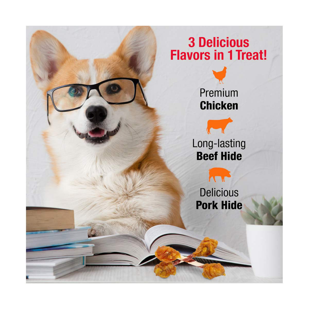- TRIPLE FLAVOR: A savory combination of real chicken, beef hide and pork hide