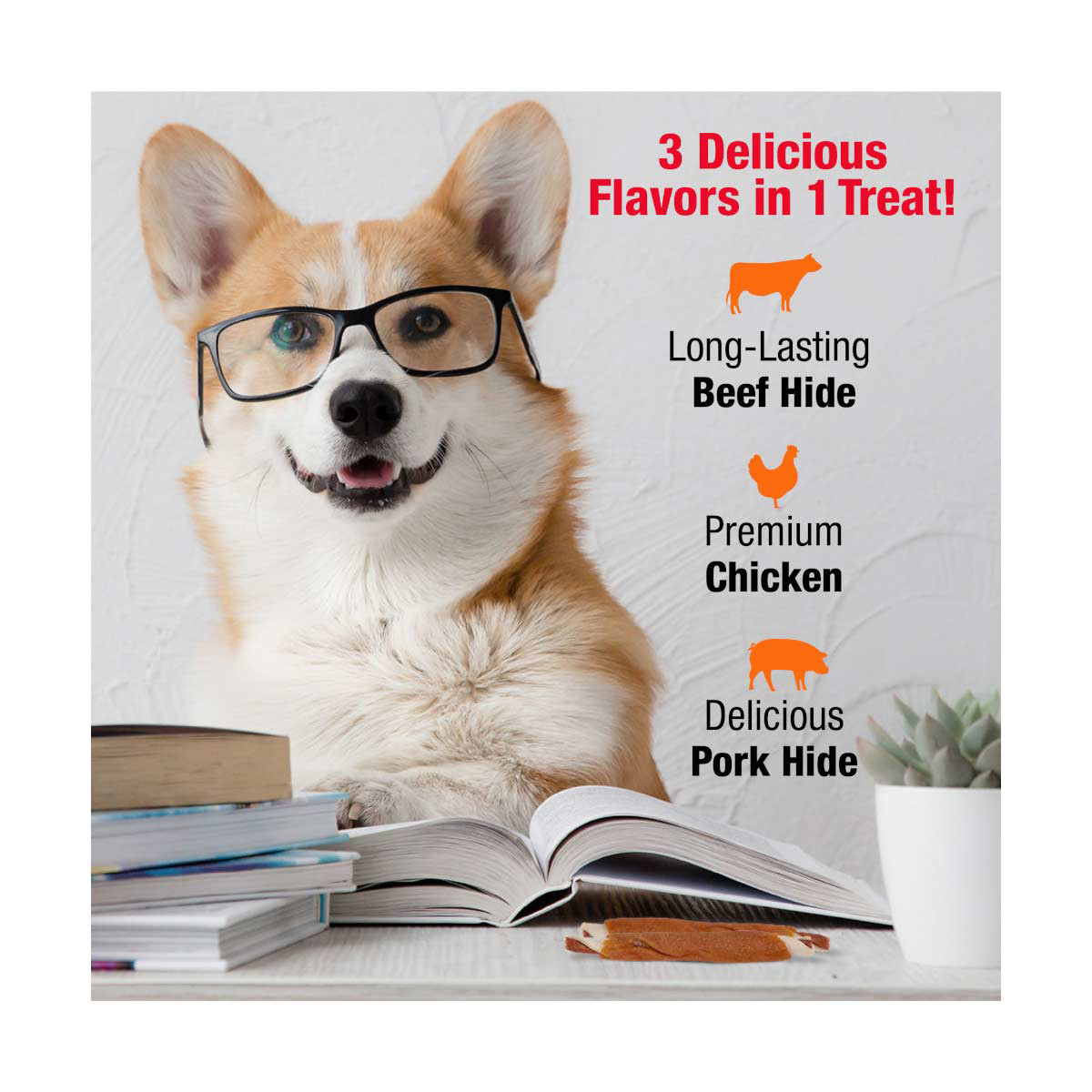 - THREE FLAVORS DOGS LOVE: Made from pork and beef hides, then wrapped with real, premium chicken