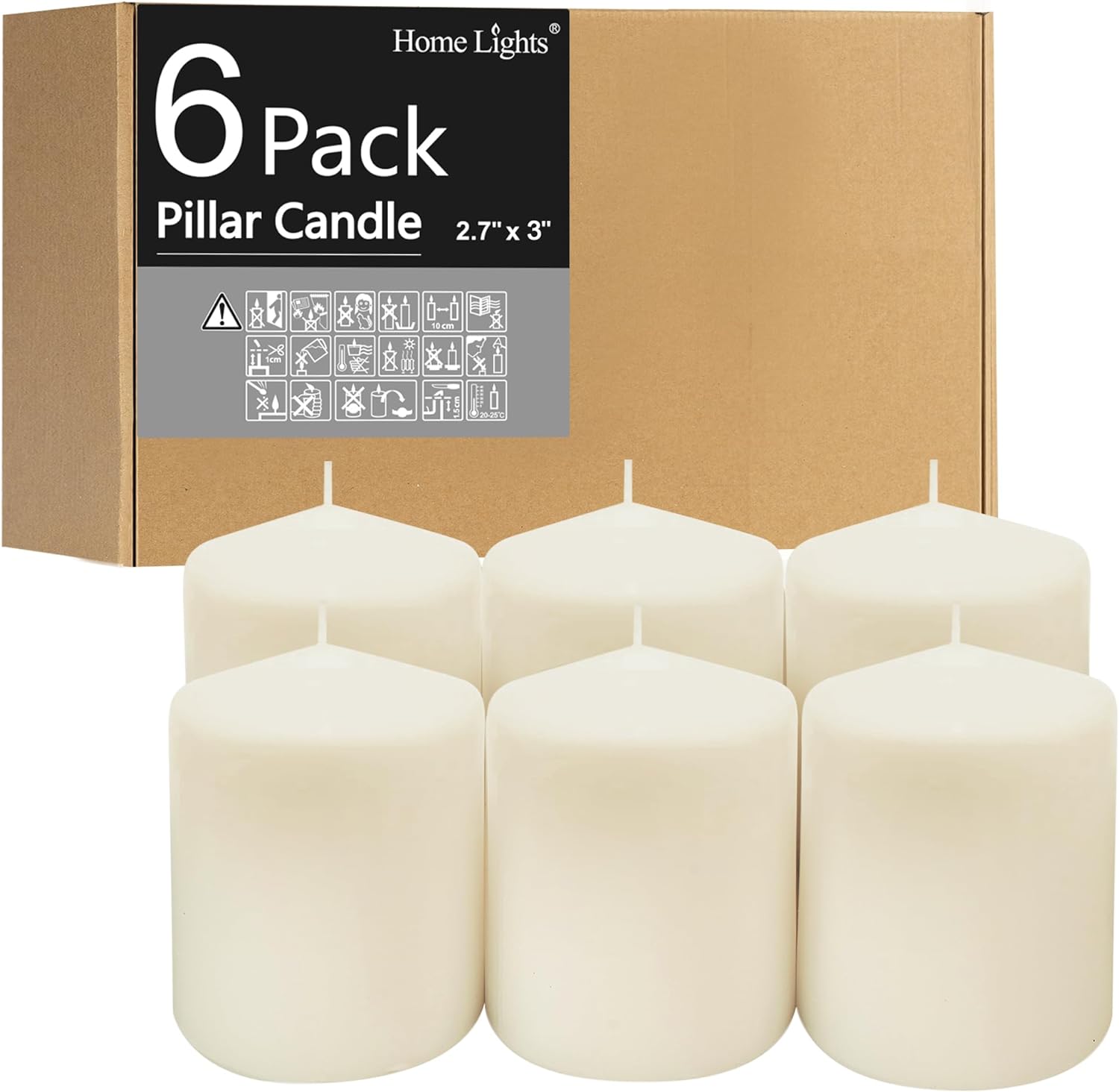 Pillar Candles - 2.7x3 inch | 30 Hours Burning, 6 Count - White Unscented Smokeless European Pillar Candles - Perfect for Wedding, Parties, Spas, Home Gatherings and Dinner