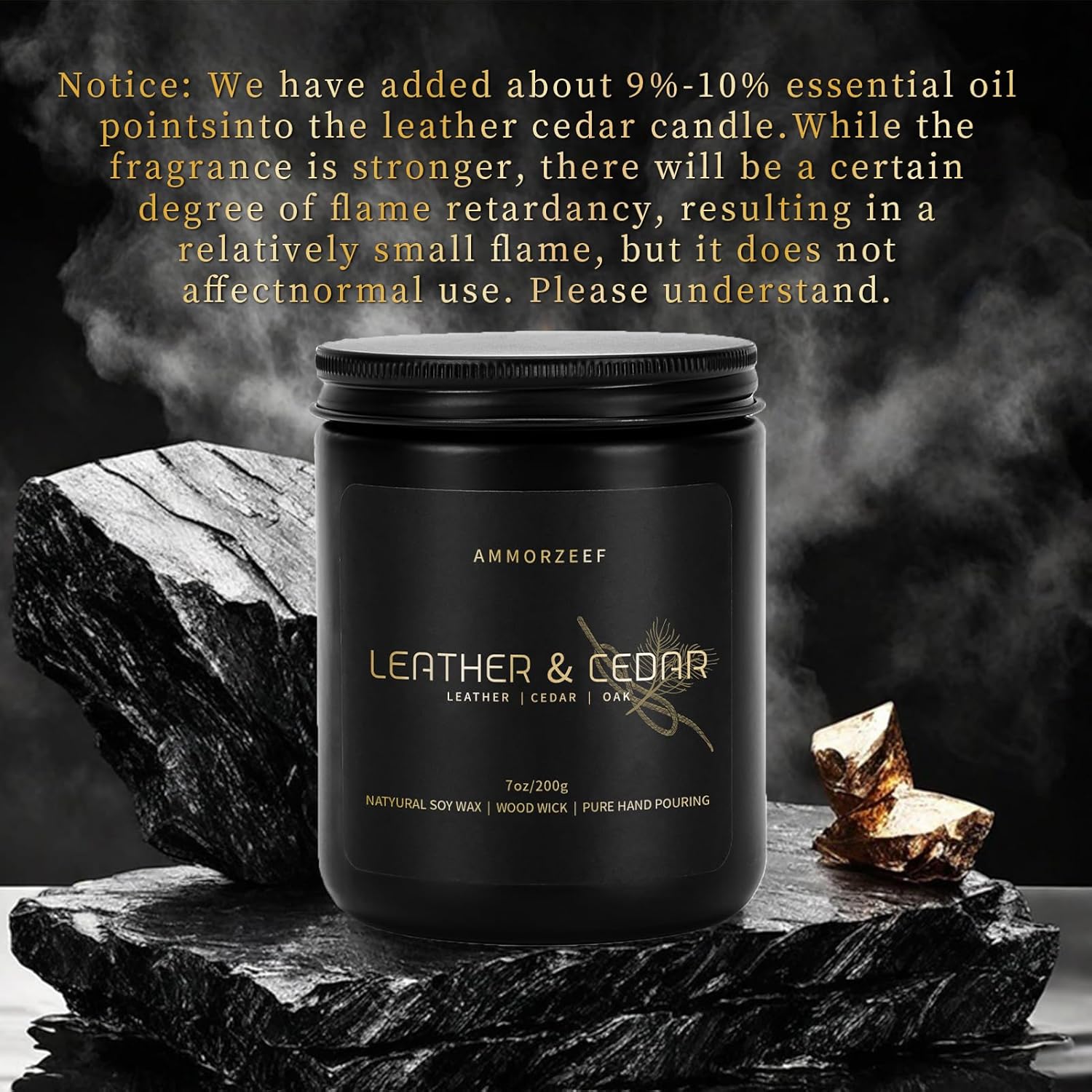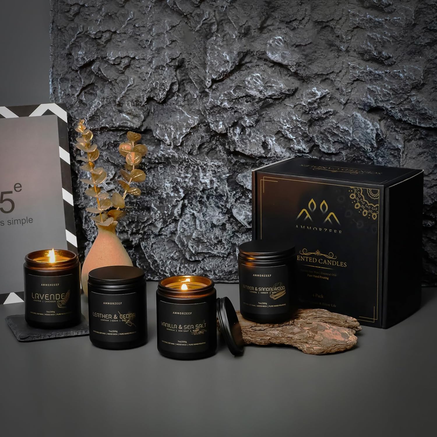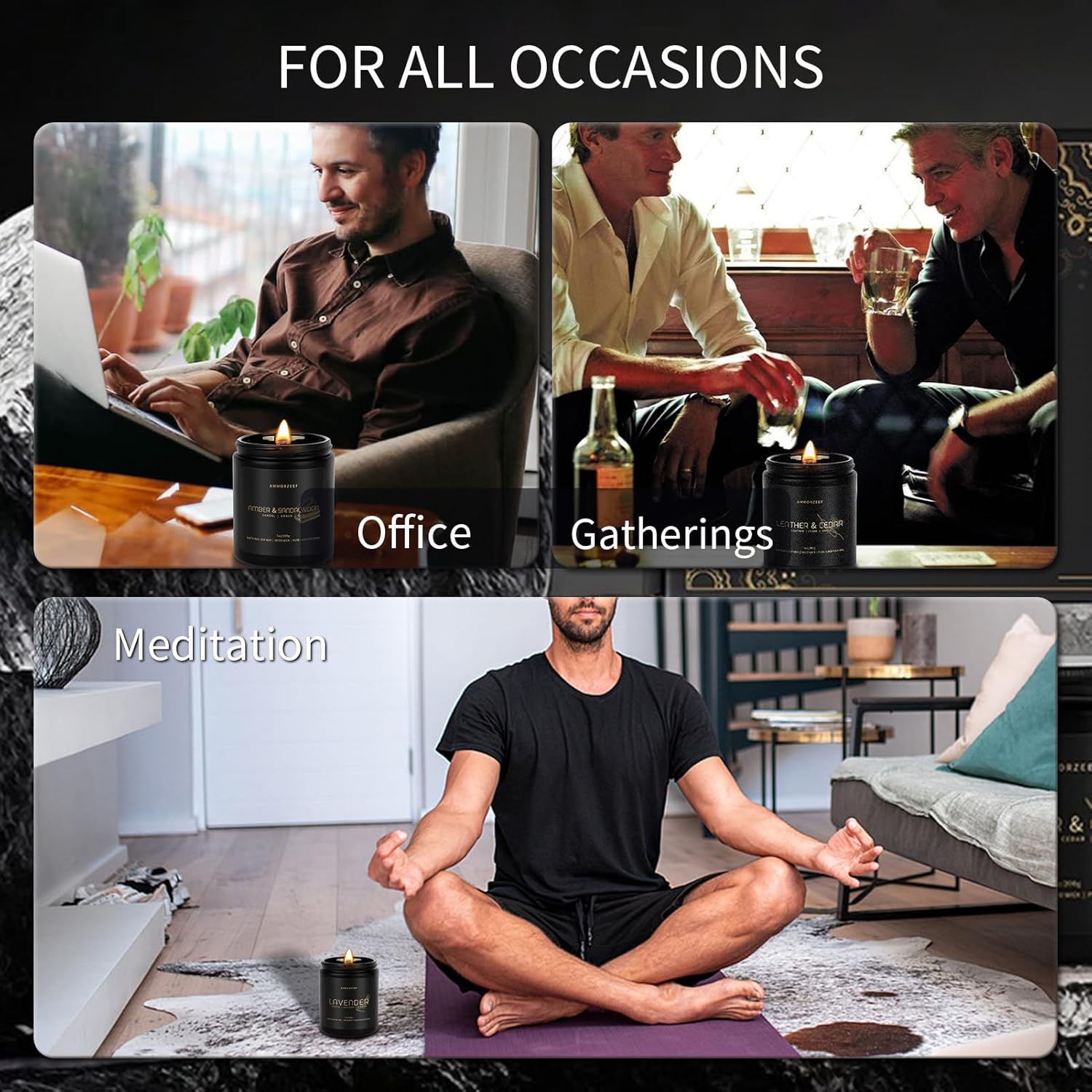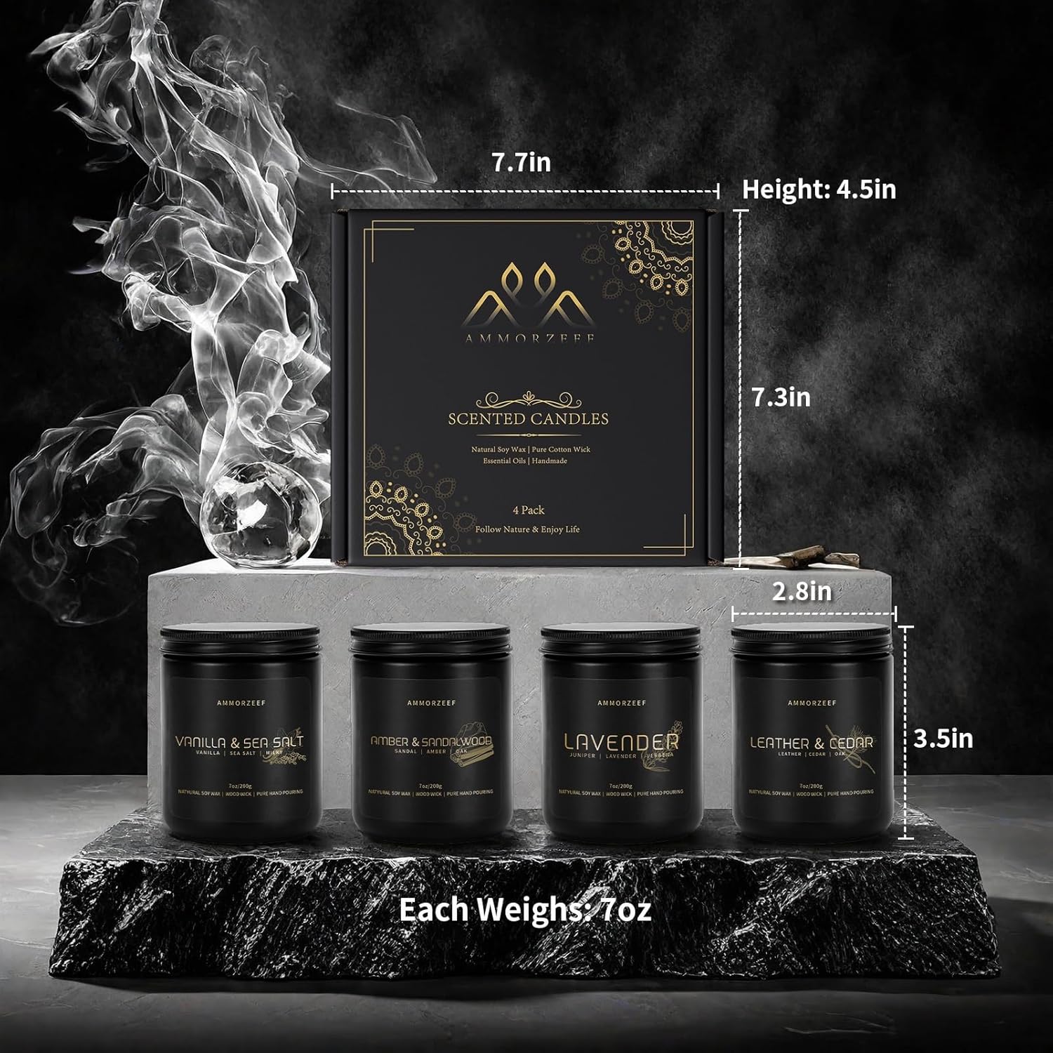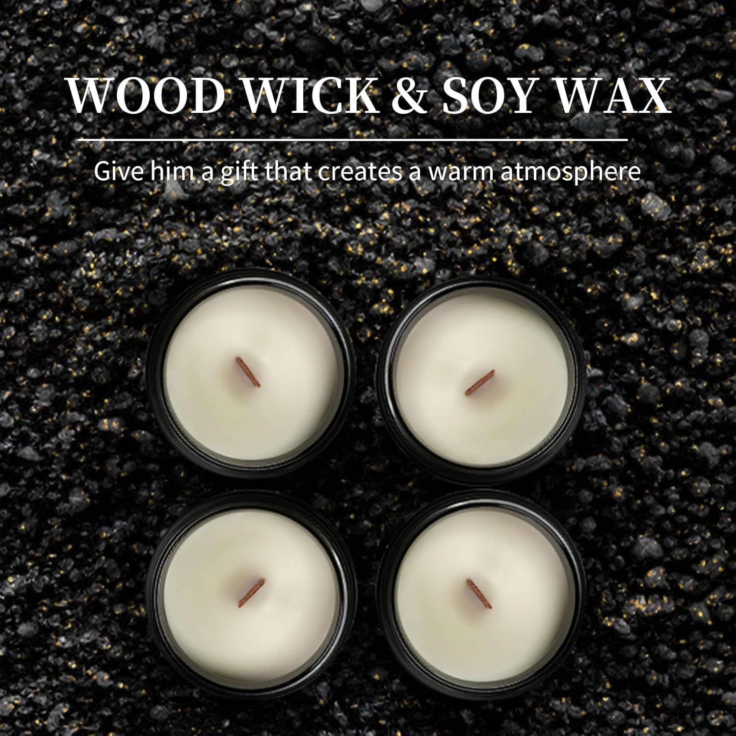 4 Pack Manly Scented Candles for Men Burn Time 200h Soy Candle Set for Home 7Oz Wood Wick Aromatherapy Candles for Relaxation Scented Leather Cedar/Lavender/Amber Sandalwood/Vanilla Candles