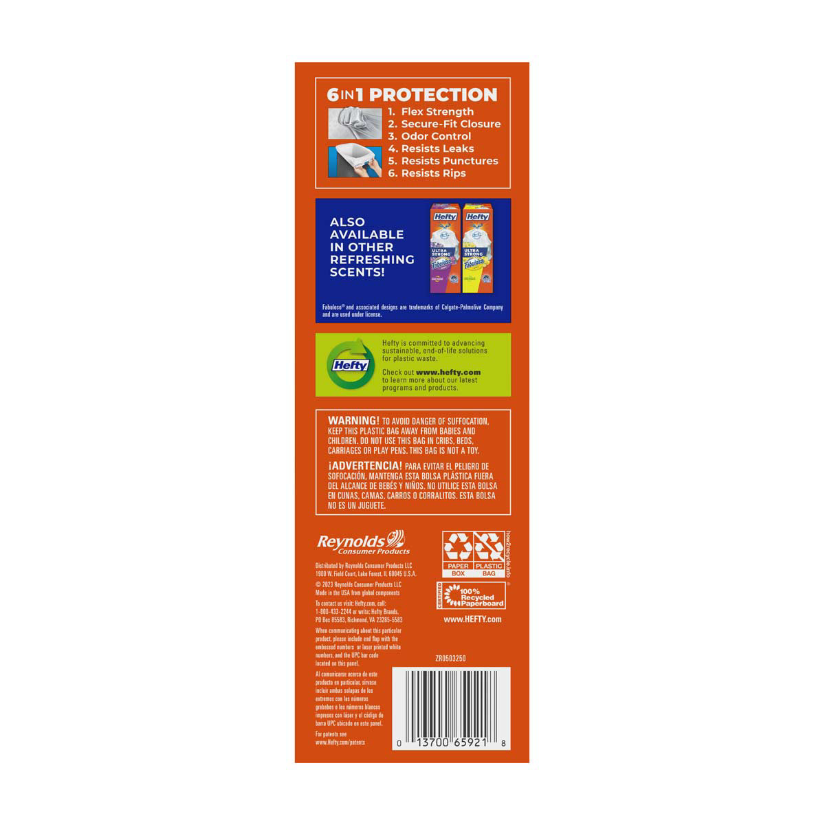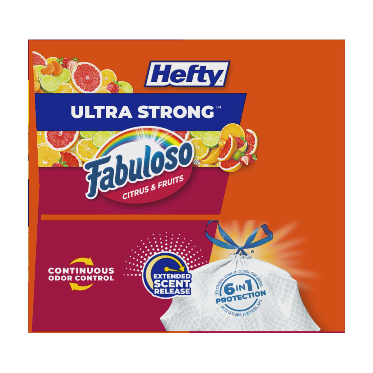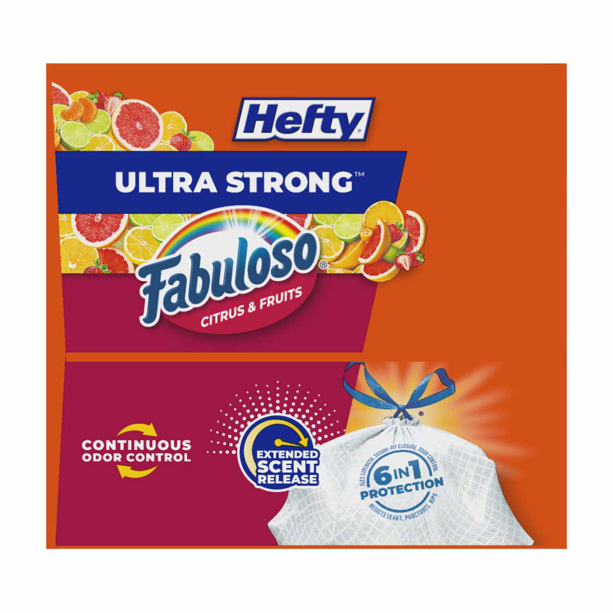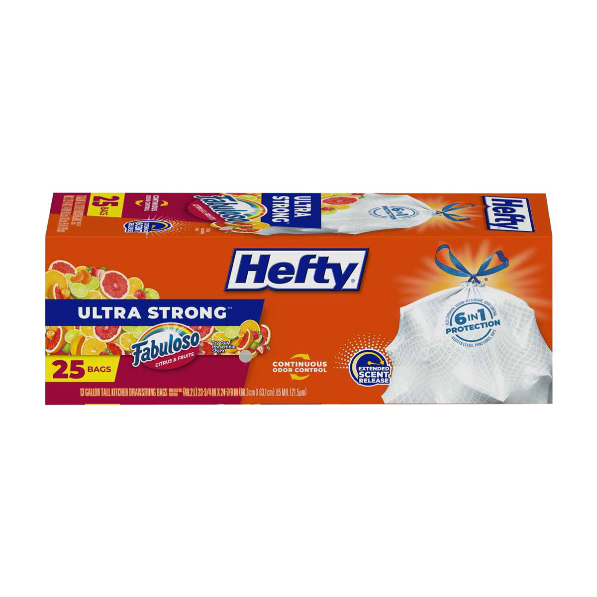 - 13 Gallon Garbage Bags—This package contains 25 Hefty Ultra Strong white, Fabuloso* Citrus and Fruits scented, 13 gallon kitchen trash bags