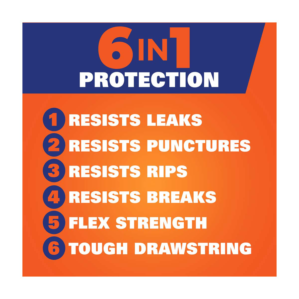 - 6-in-1 Protection: These flexible scented large trash can liners offer six points of protection to keep garbage where it belongs: flex strength, tough drawstring, odor control, and resistance to leaks, punctures, and rips