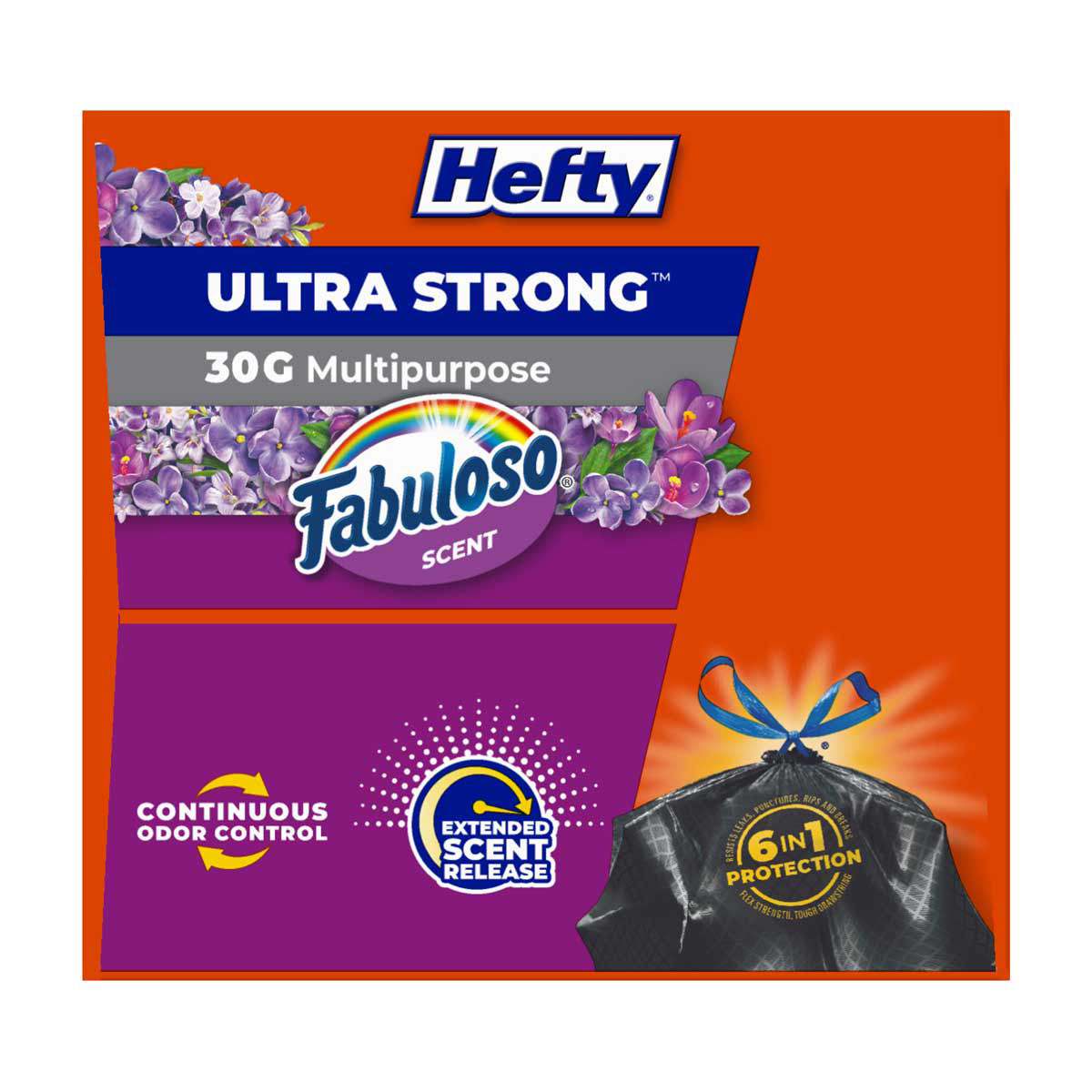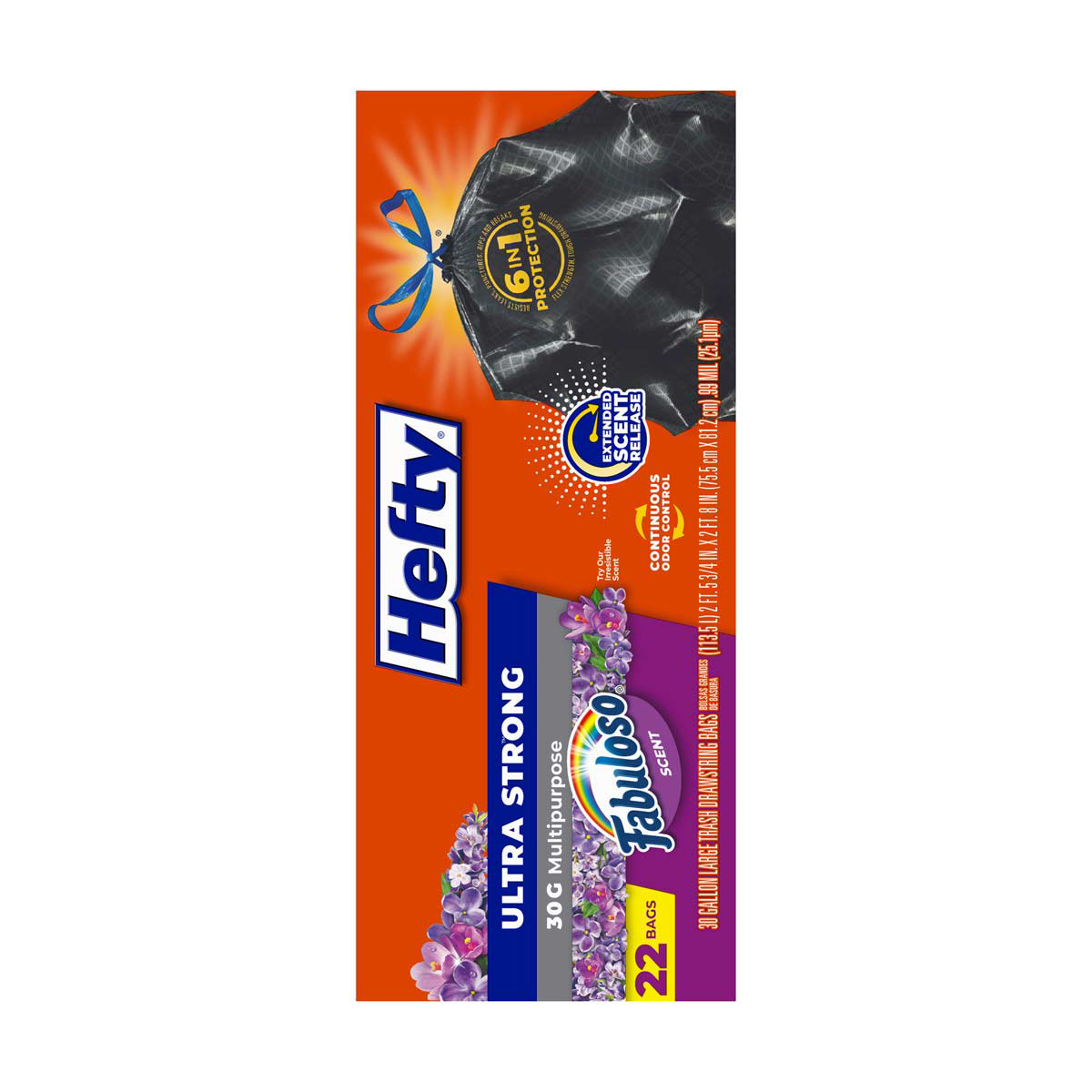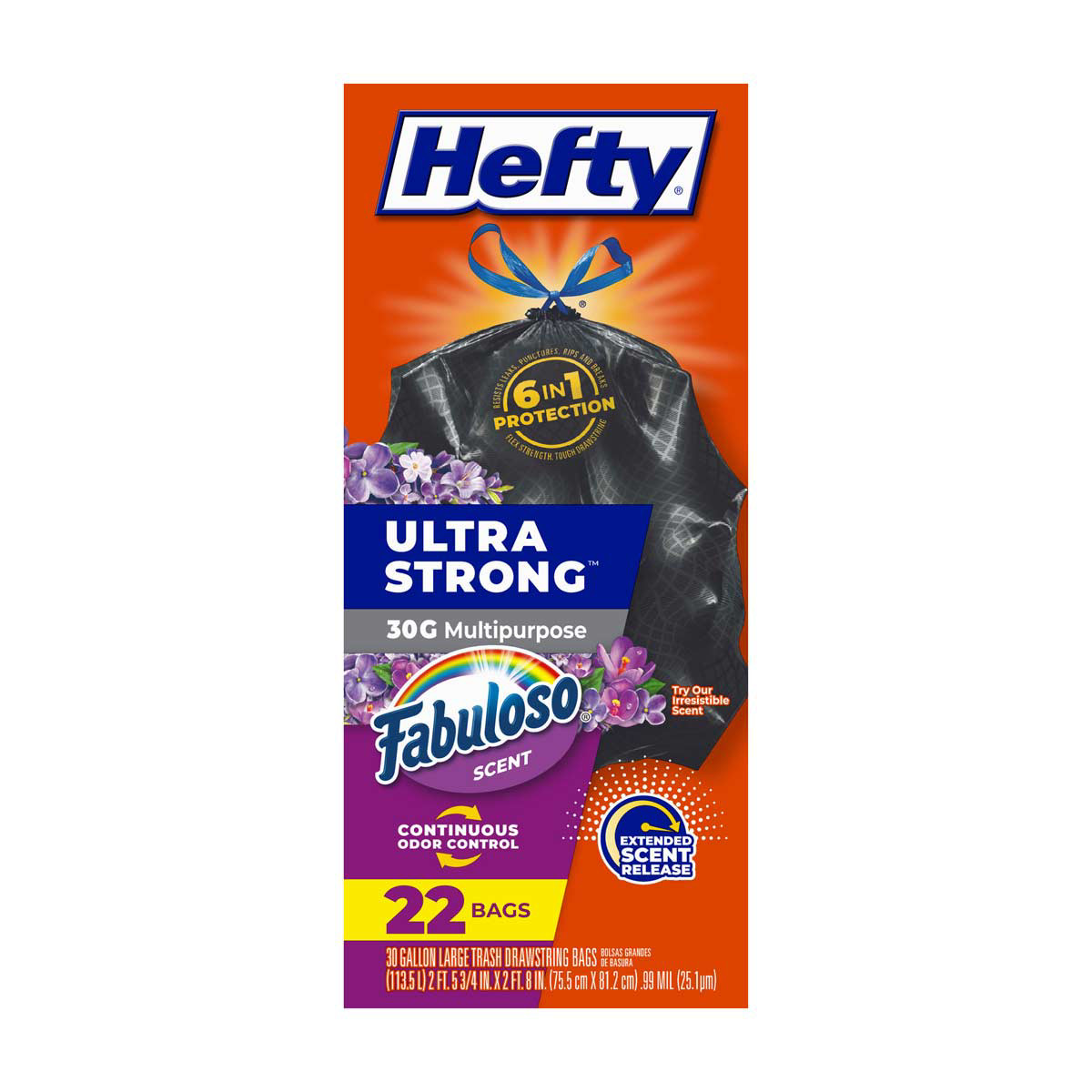 - Large Garbage Bags: This package contains 22 Hefty Ultra Strong 30 Gallon Drawstring Trash Bags in Black, Fabuloso scent
