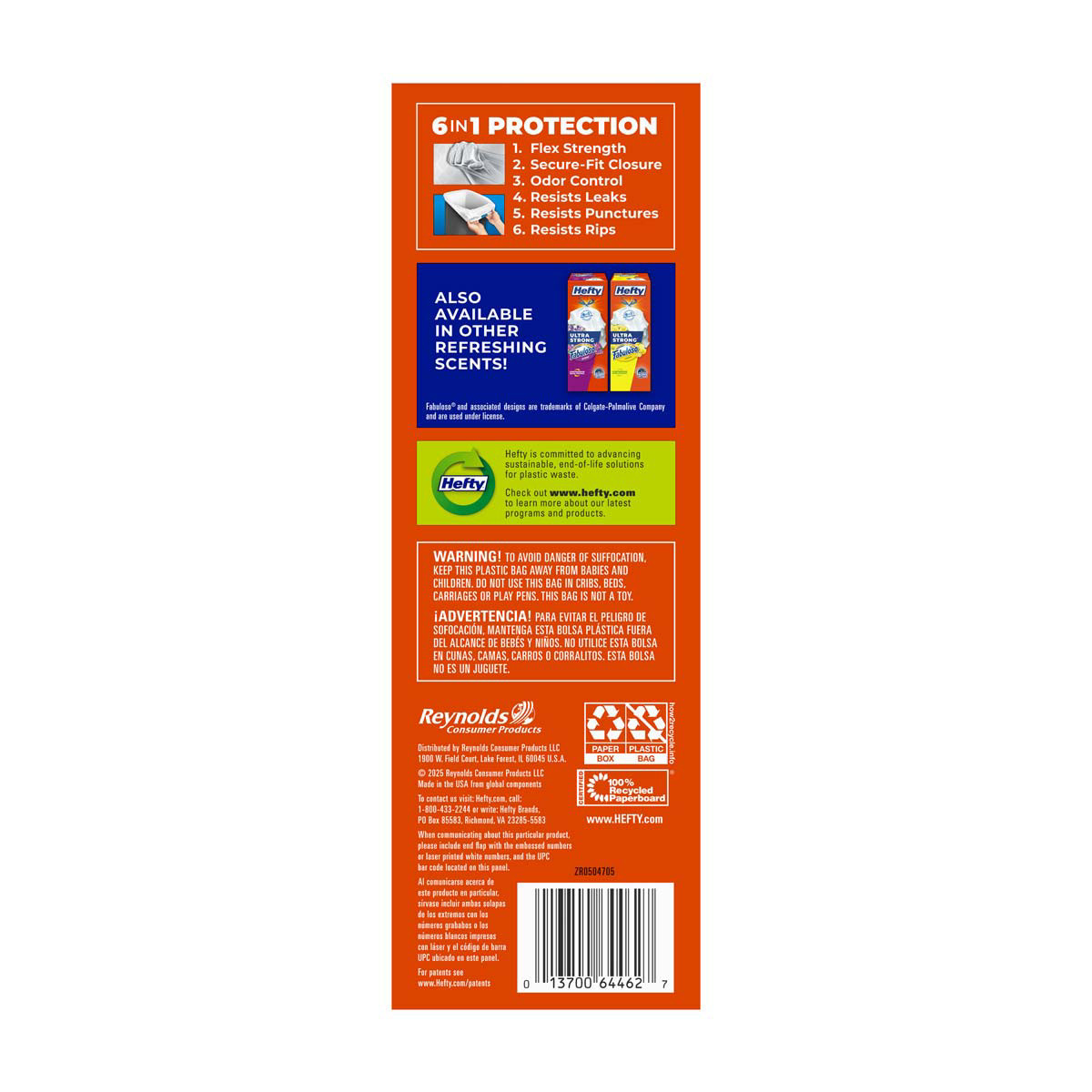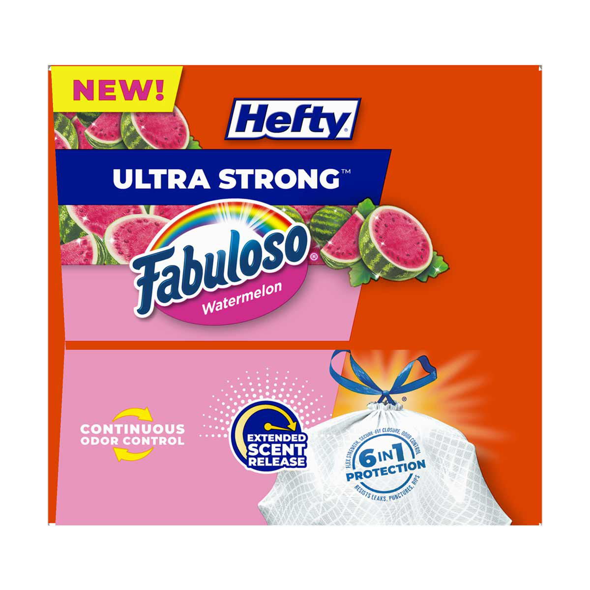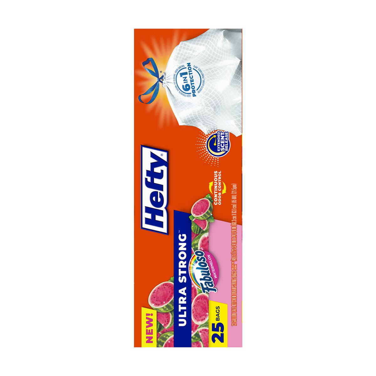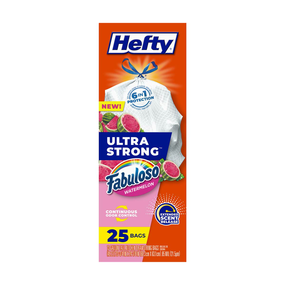 - 13 Gallon Tall Kitchen Garbage Bags—This package contains 25 Hefty Ultra Strong 13 Gallon Kitchen Trash Bags in White, Fabuloso Watermelon scent
