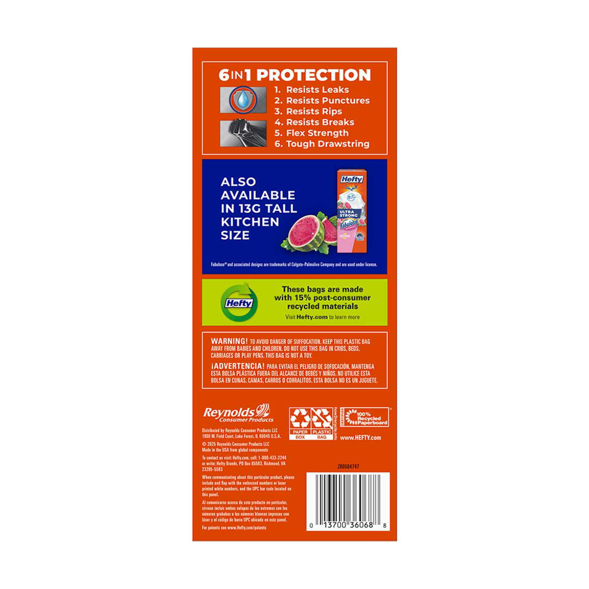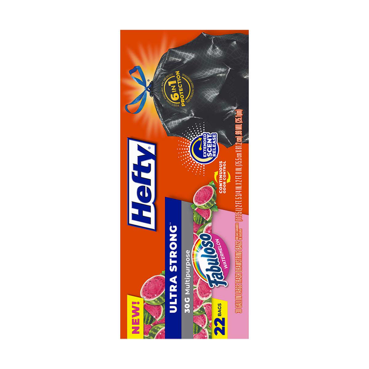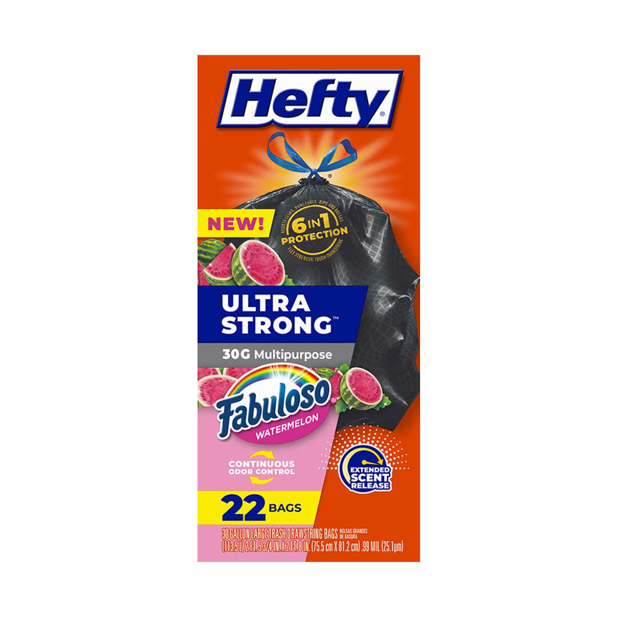 - Large Garbage Bags—This package contains 22 Hefty Ultra Strong 30 Gallon Drawstring Trash Bags in Black, Fabuloso Watermelon scent