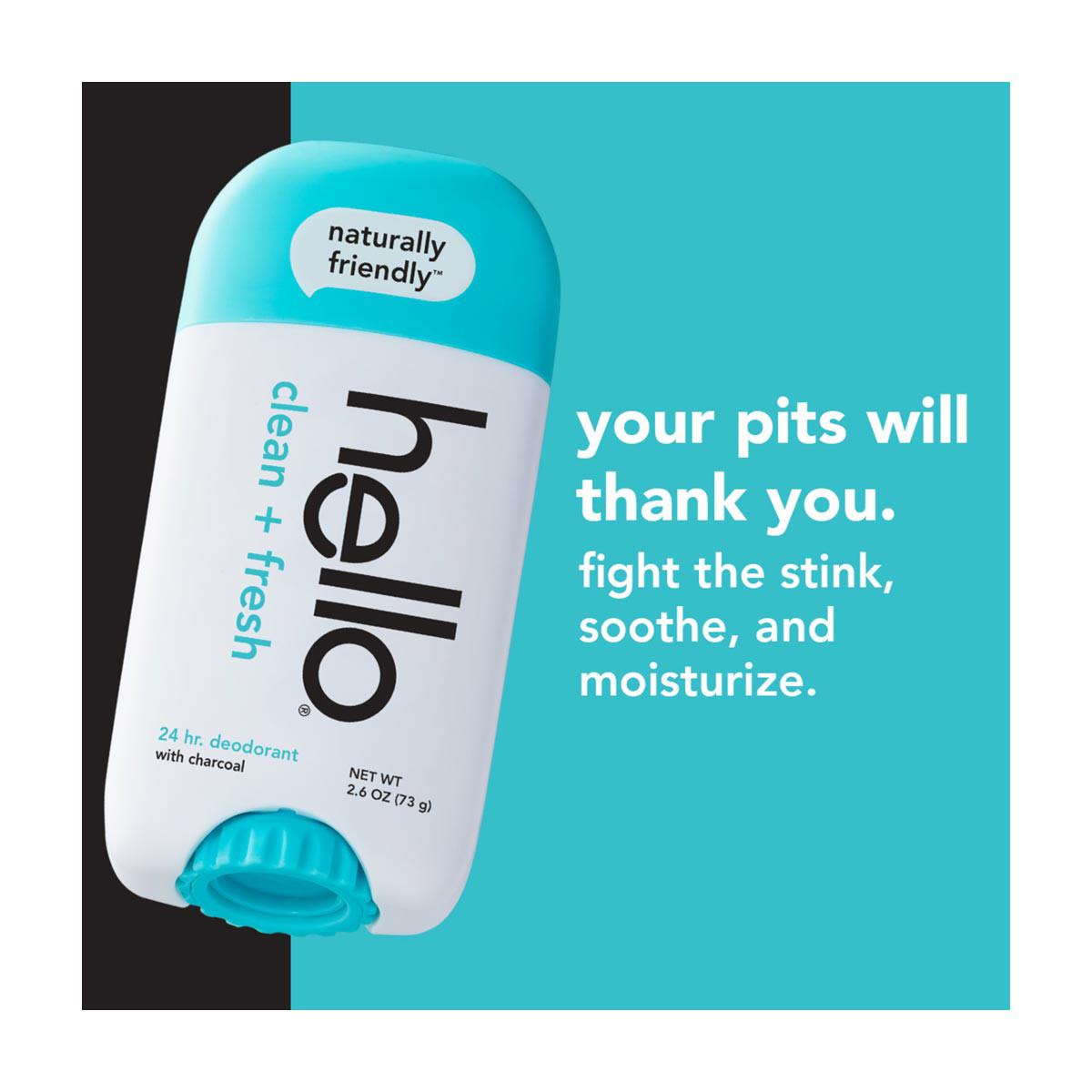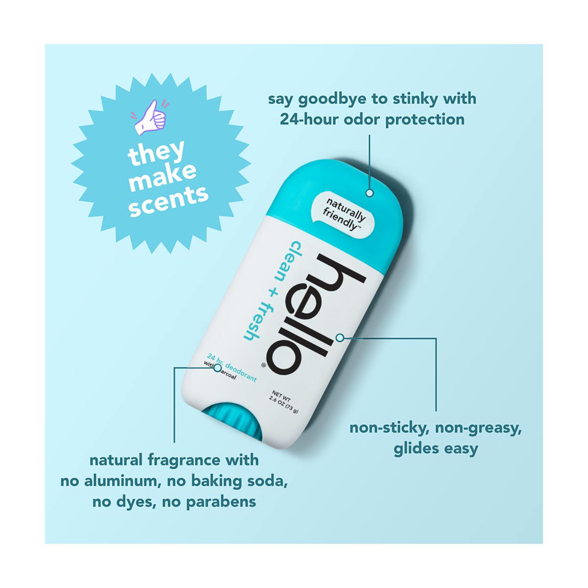 - one 2.6 oz hello Clean + Fresh Aluminum Free Deodorant for Men and Women