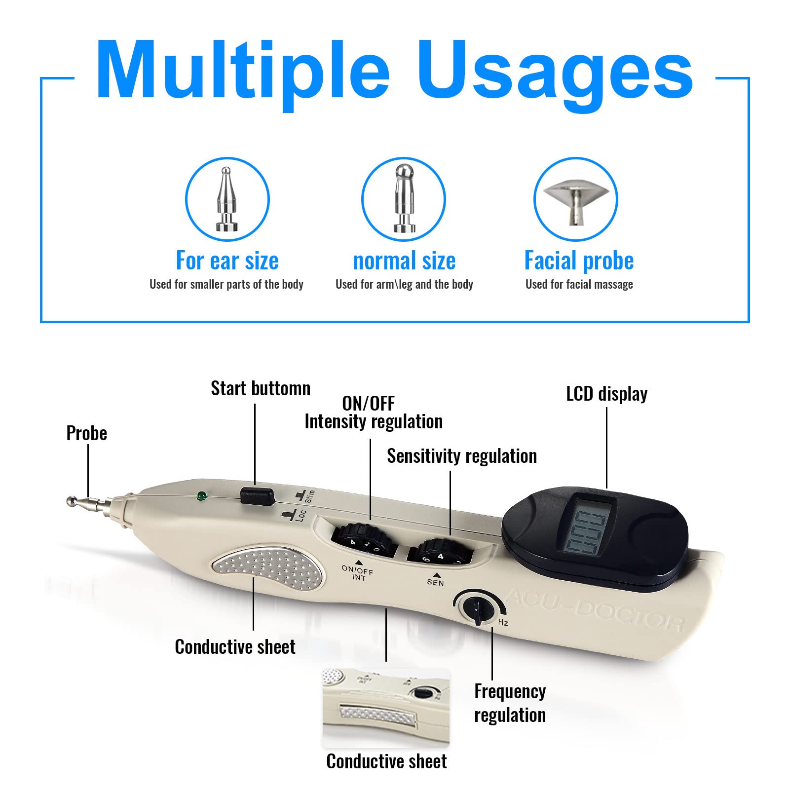 - NO NEEDLES & EASY TO USE:Simply press the massage tools on the affected area, and it will release a proper pulse to the meridian and acupuncture points, improving blood circulation. There are no needles needed so it is not only painless but the skin is never even punctured at all, making it safe to use at home. Come with a user manual that has several charts about the body's therapeutic acupoints showing where to use the massage pen.