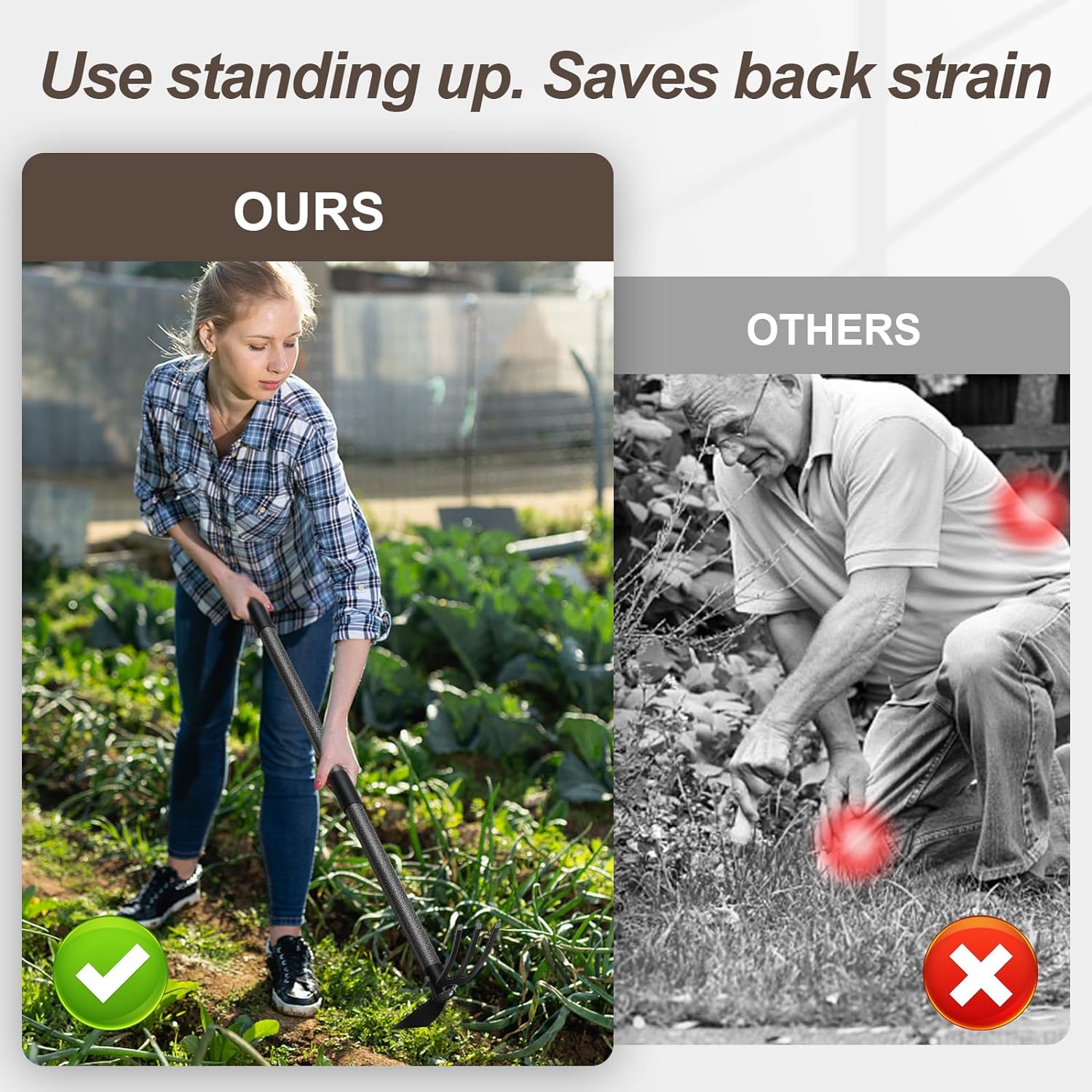 - No Bending Need: 45 Inch long overall. This hoe garden tool long handle handle is ergonomically designed to reduce the pain in joint caused by the bending of your back when doing yard work.