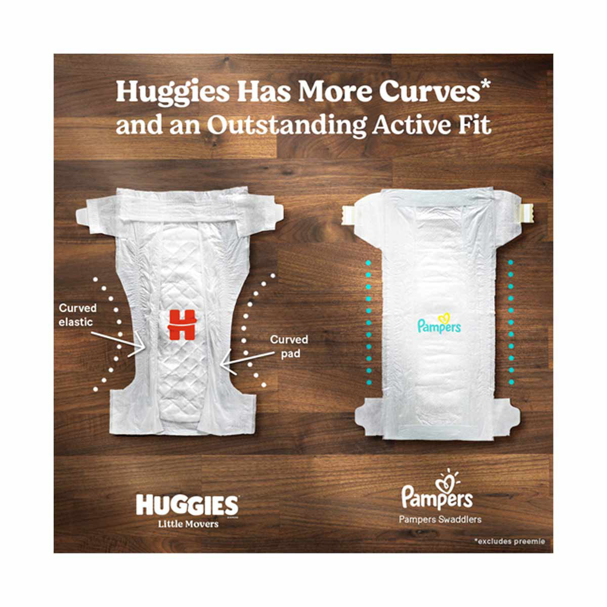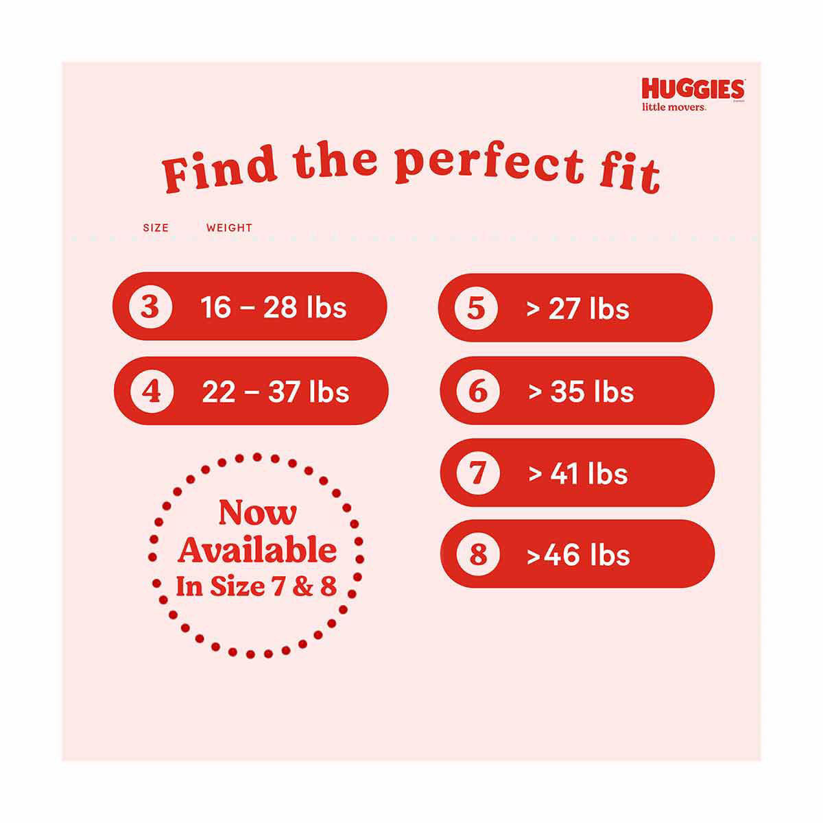 - Huggies Little Movers Diapers: 16 baby diapers, size 6 (35+ lbs). Up to Zero Leaks, Even from Blowouts: Our baby diapers have a curved and stretchy fit and are designed to help eliminate gaps at the legs and waist