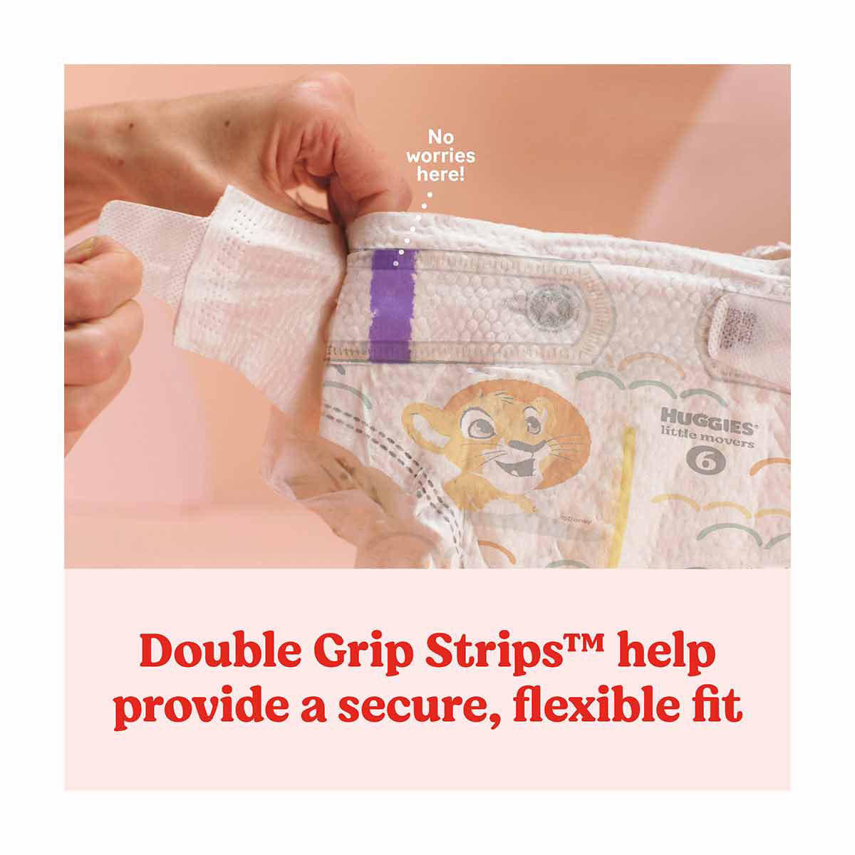 - Unique Waistband: Huggies Little Movers diapers come with a waistband that is designed to prevent leaks and help keep your baby comfortable while on the move. For Babies on the Move: Double Grip Strips help provide a secure, flexible fit that moves with your baby
