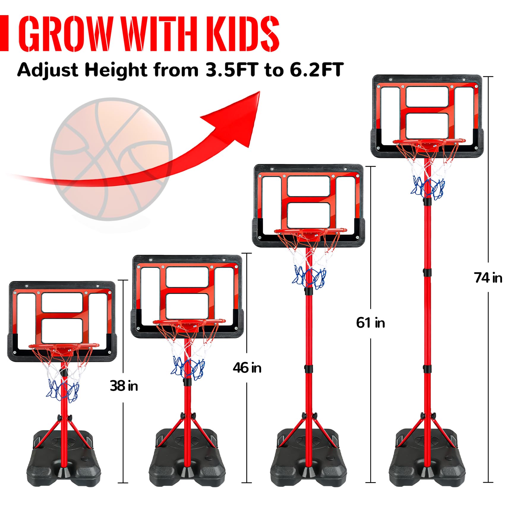 - Mini Basketball Hoop for Kid: The kids basketball hoop come with a basketball backboard, 3 basketball, an inflatable pump, a rim, a net, a sturdy base and other accessories. Extremely easy to assemble and take apart referring to the installation instruction. The height of this mini basketball hoop is adjustable, it can be adjusted according to kids' growing height from 3.5ft to 6.2ft, suitable for kids aged 3-8 with different heights.