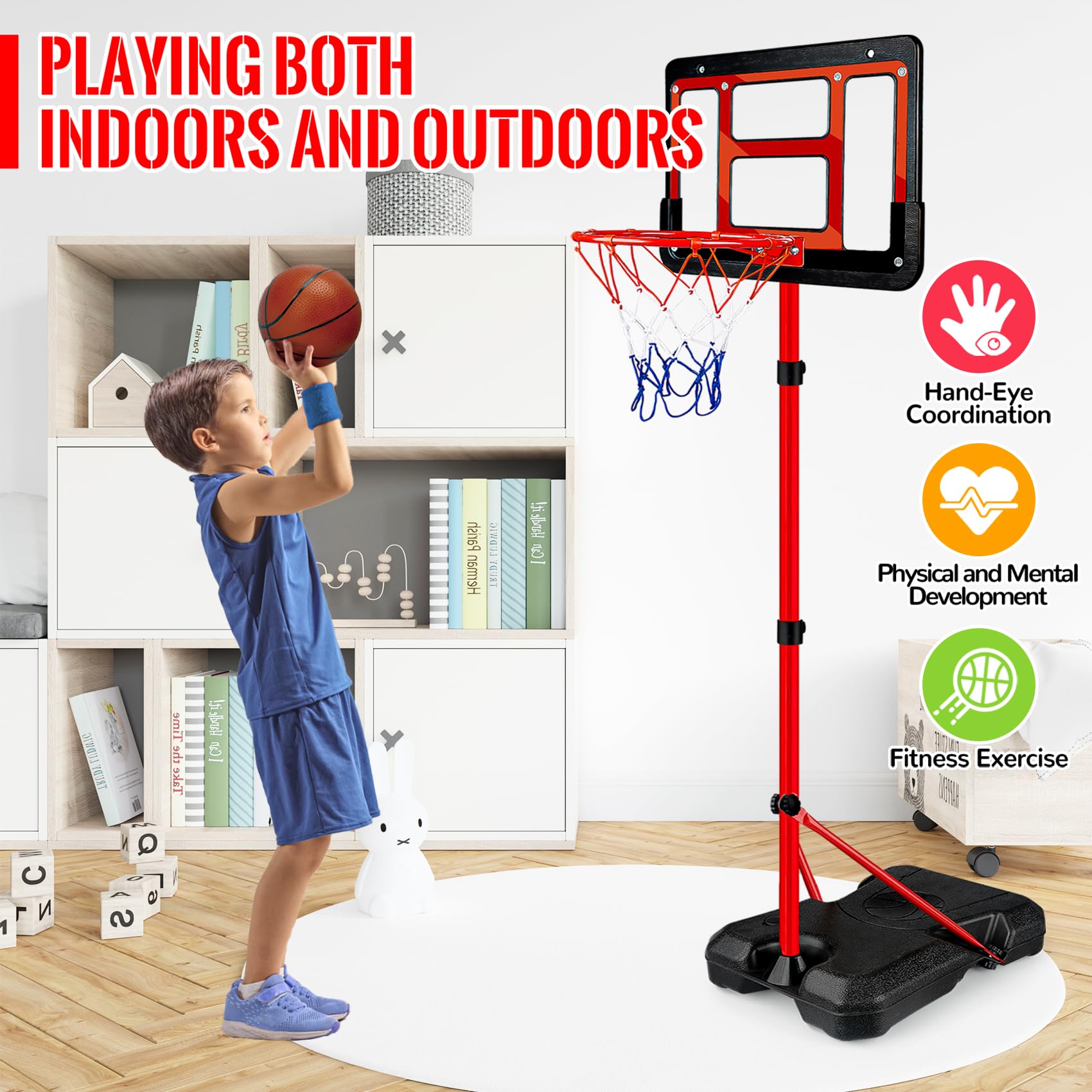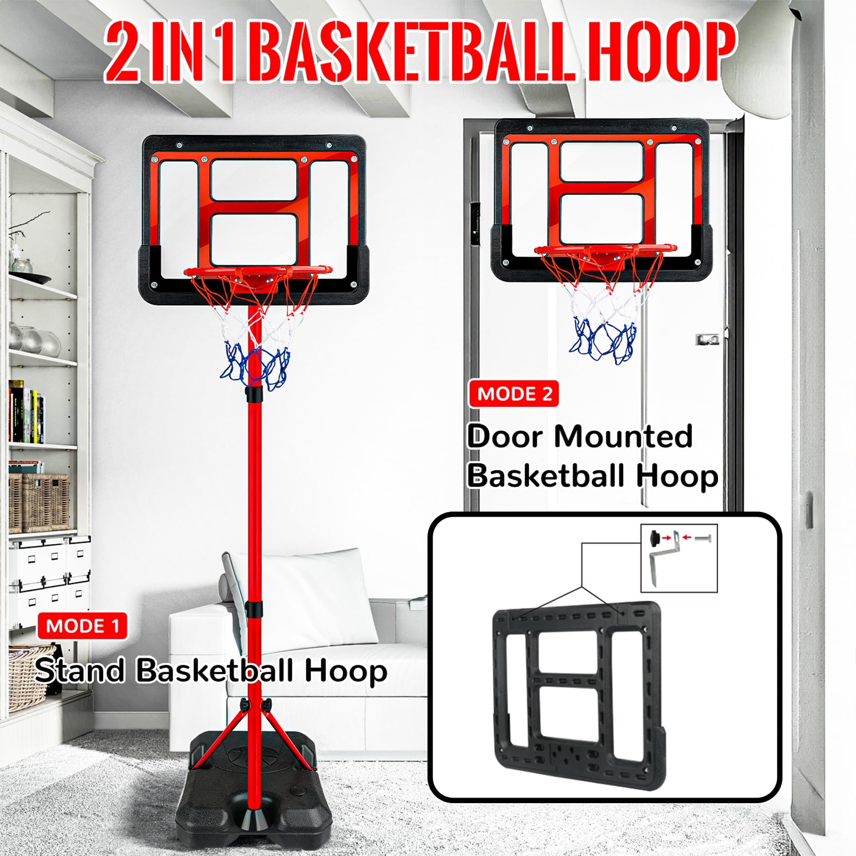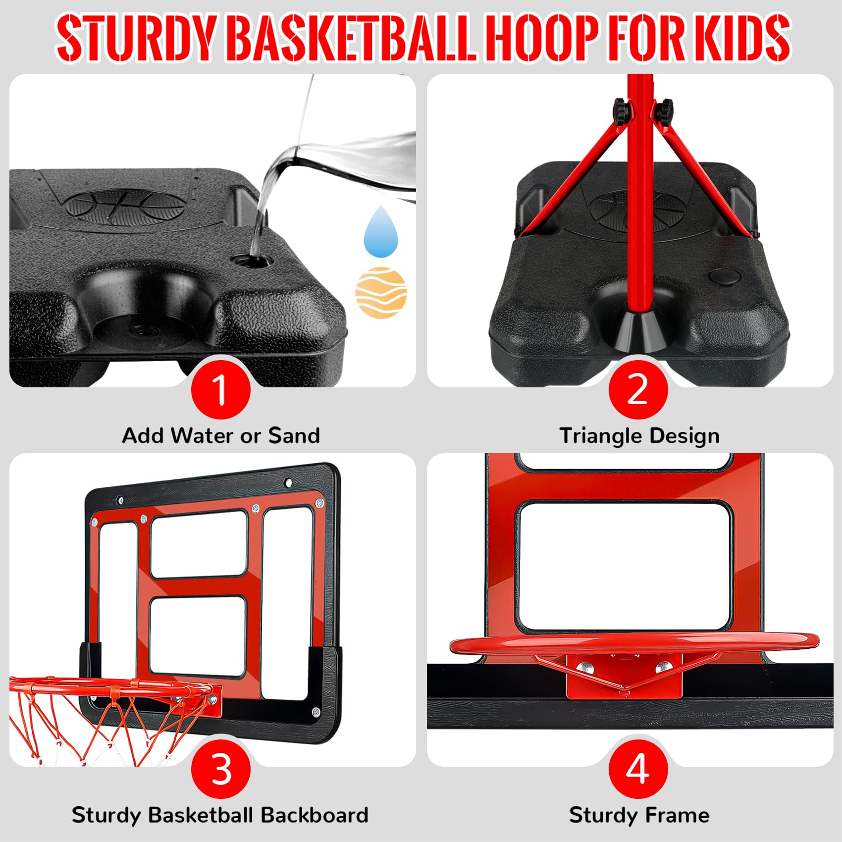 - Basketball Hoop for Boys: Our basketball hoop set is made of non-toxic and sturdy material, safe for kids. The triangle design of the base and pole enhances the stability of the basketball hoop, and adding water or sand to the base further reduces any shaking. Kids get a 2-in-1 mini basketball set with options of stand or wall/door mounted. Not only can be shotting outdoor or indoor but also hang on common sized doors or walls indoor for playing. Enjoying basketball games anywhere and anytime.