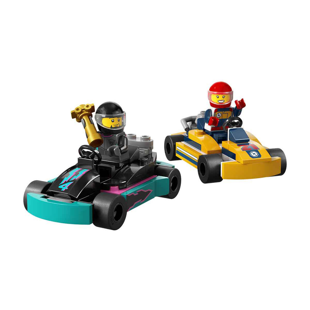 - Includes everything kids need to build two go-karts, one turquoise and one orange, complete with two race driver minifigures and a winner's trophy element