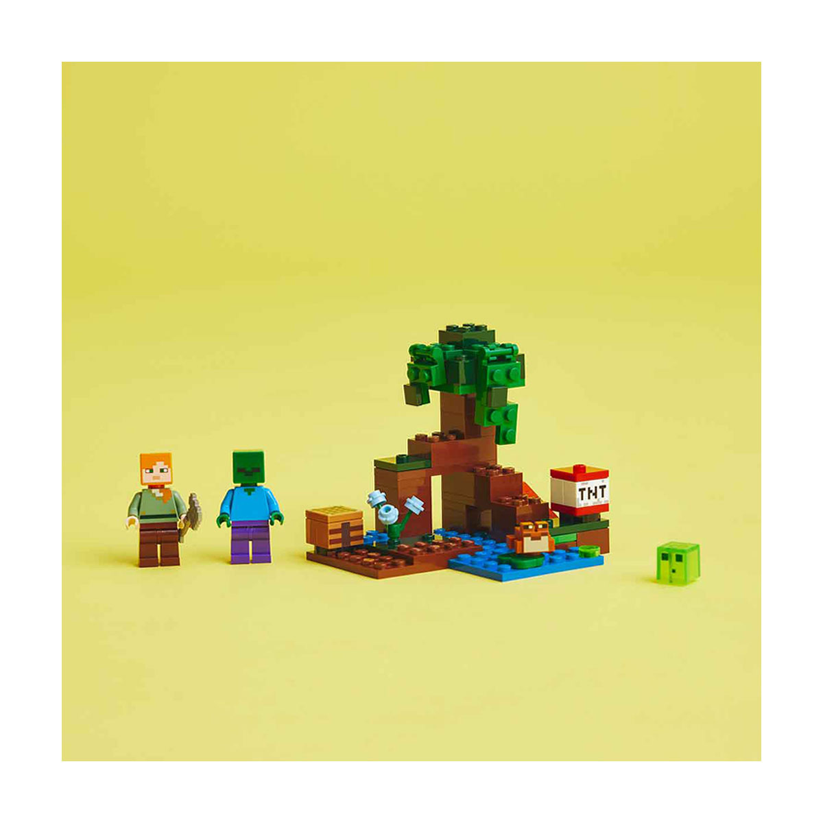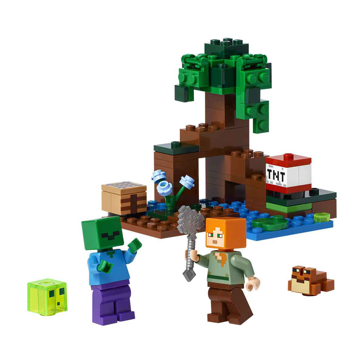 - Includes familiar Minecraft® favorites Alex, a zombie, a slime block, and a frog in a swamp biome complete with a mangrove tree, axe, and exploding TNT function