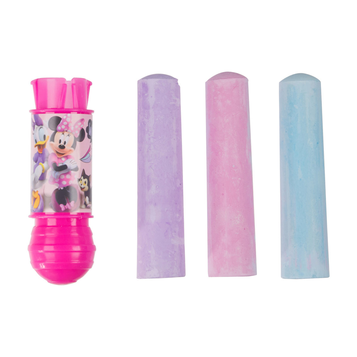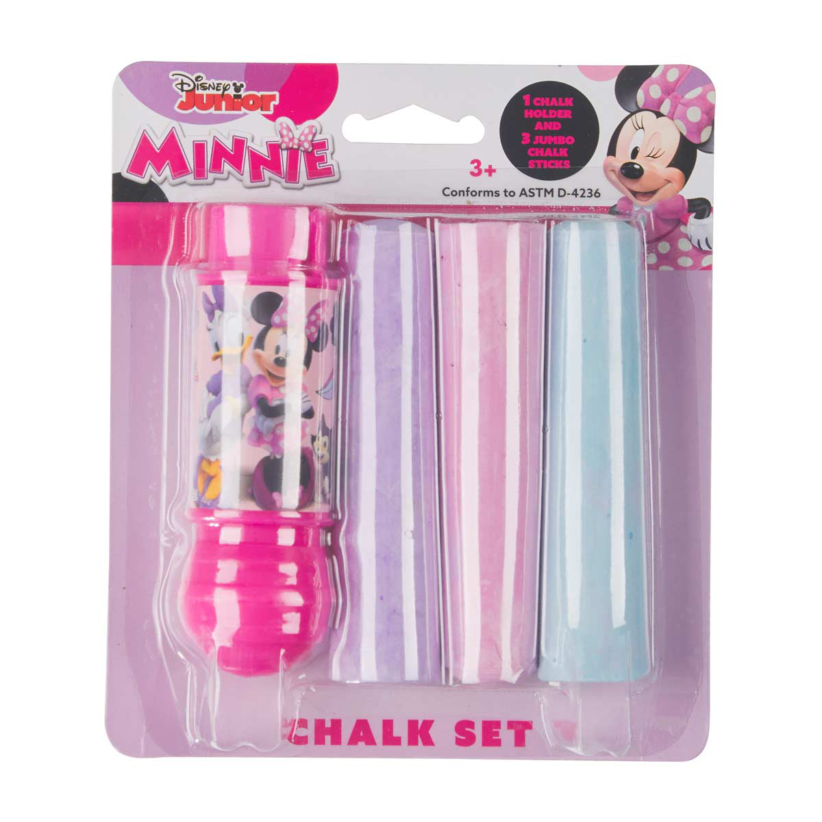 - - Features a Minnie Mouse-themed chalk holder for clean, easy handling- Includes 3 jumbo chalk sticks in pastel pink, purple, and blue- Perfect for outdoor drawing and coloring on various surfaces- Encourages creativity, outdoor play, and fine motor skills- Non-toxic and conforms to ASTM D-4236 standards- Suitable for children aged 3 years and up- A delightful gift for young Disney fans and aspiring artists