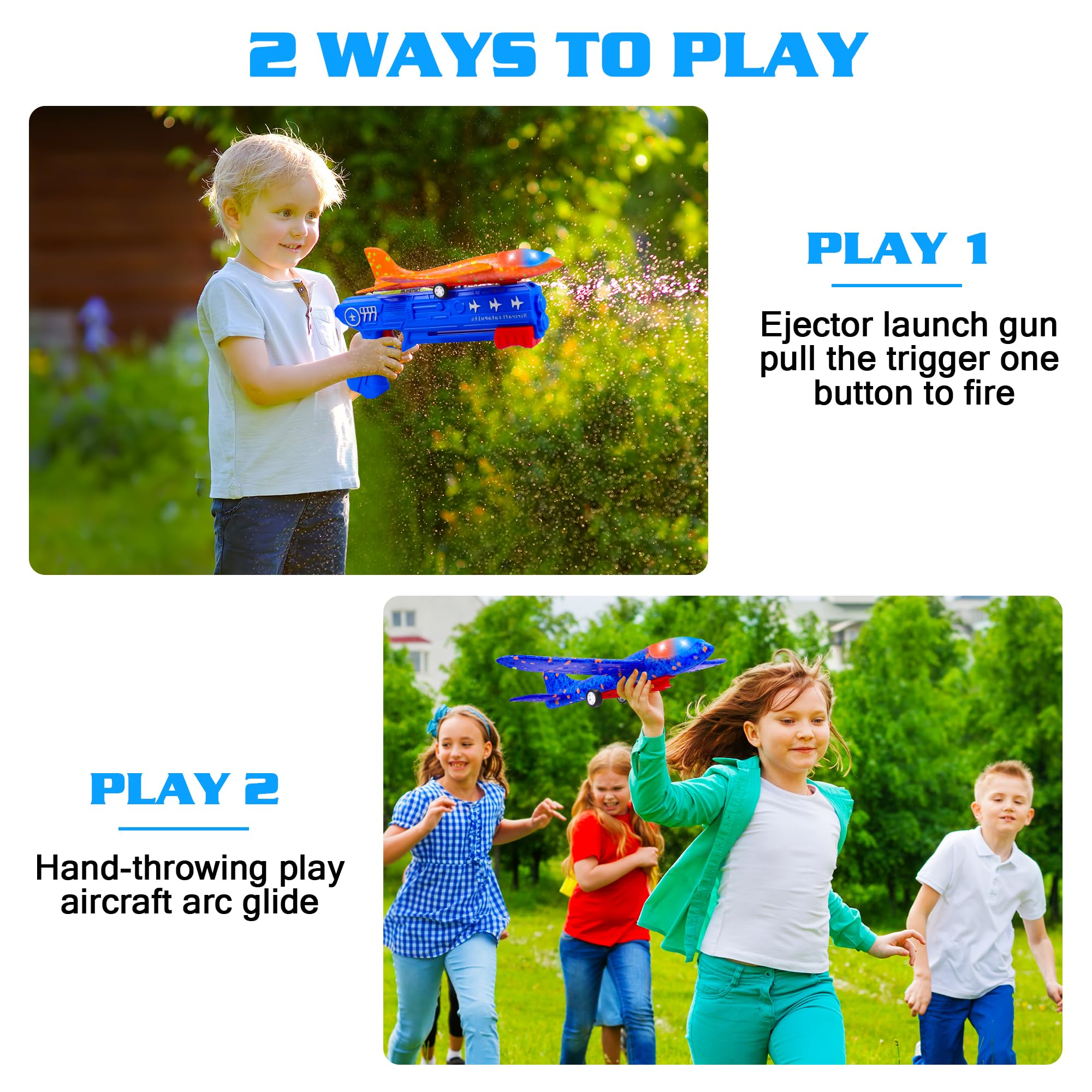 • 3 Fun Ways To Play - Foam glider-led plans can not only use the airplane launcher to achieve flight, but also can be thrown airplane toys into the sky and ground manually, or slid by hand boys toys. This plane brings endless fun to children, and outdoor toys and more novel ways to play are waiting for you to discover! In addition, glider planes for kids have no restrictions on the launch site, you can play indoors and outdoors!
