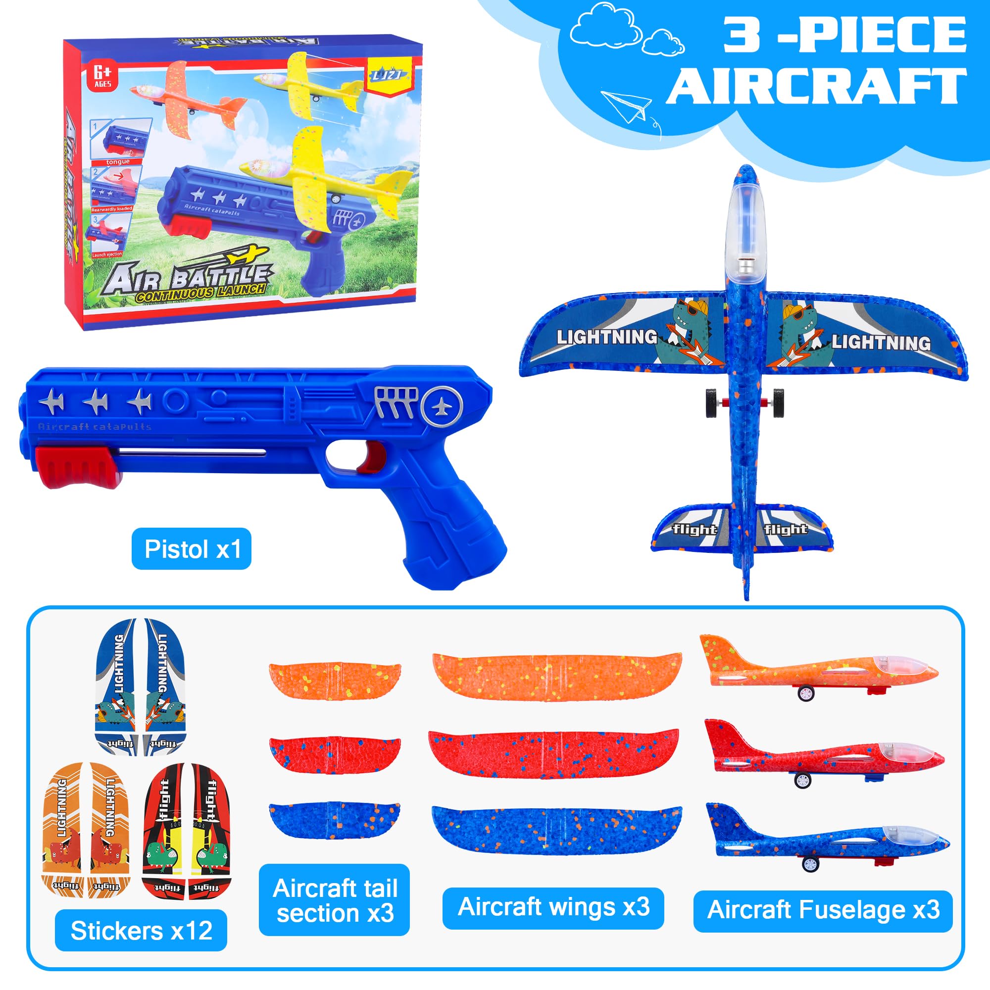 • LJZJ 3 Pack Airplane Launcher Toys, 2 Flight Modes LED Foam Glider Catapult Plane, Outdoor Flying Toy for Kids, Birthday Gifts for Boy Girl 6+ Year Old, B-Day Party Supplies