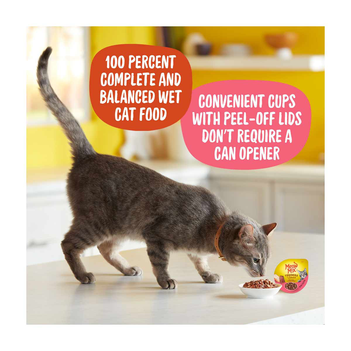 - Convenient cups with peel-off lids don't require a can opener. The irresistible appeal of Meow Mix cat food, The Only One Cats Ask for by Name
