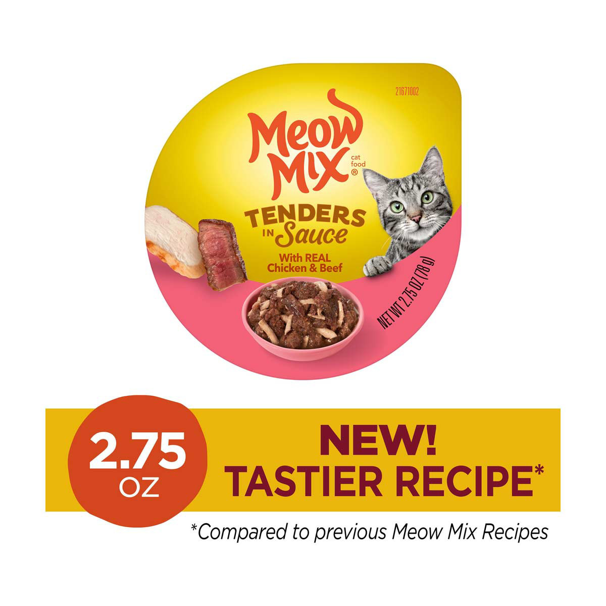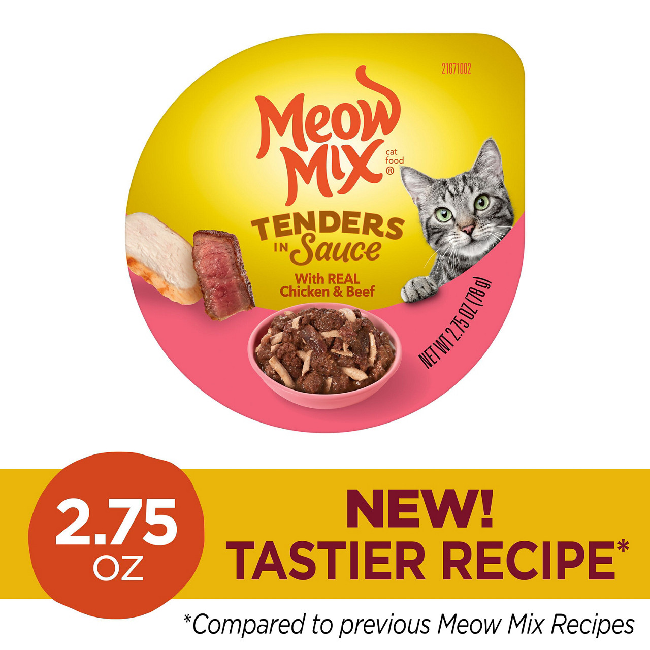 - Contains one (1) 2.75-oz. cup of Meow Mix Tenders in Sauce wet cat food — previously known as Meow Mix Tender Favorites