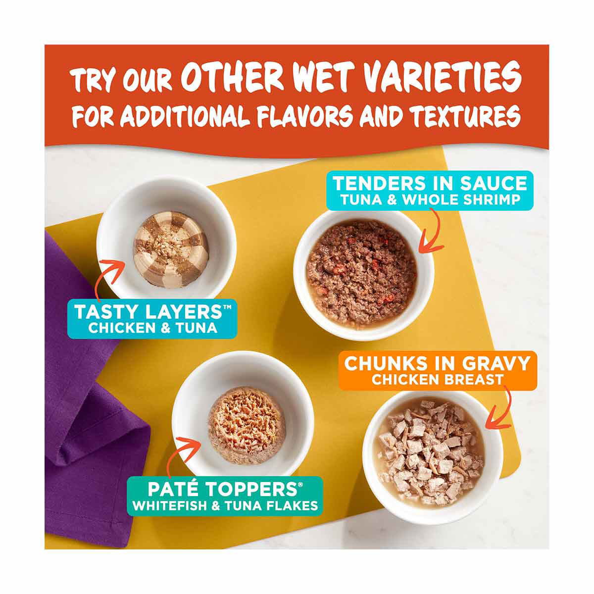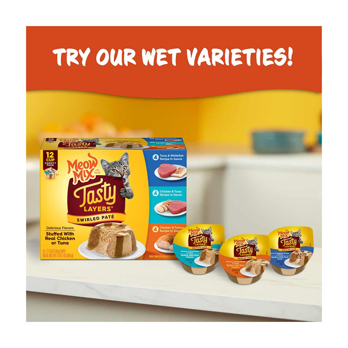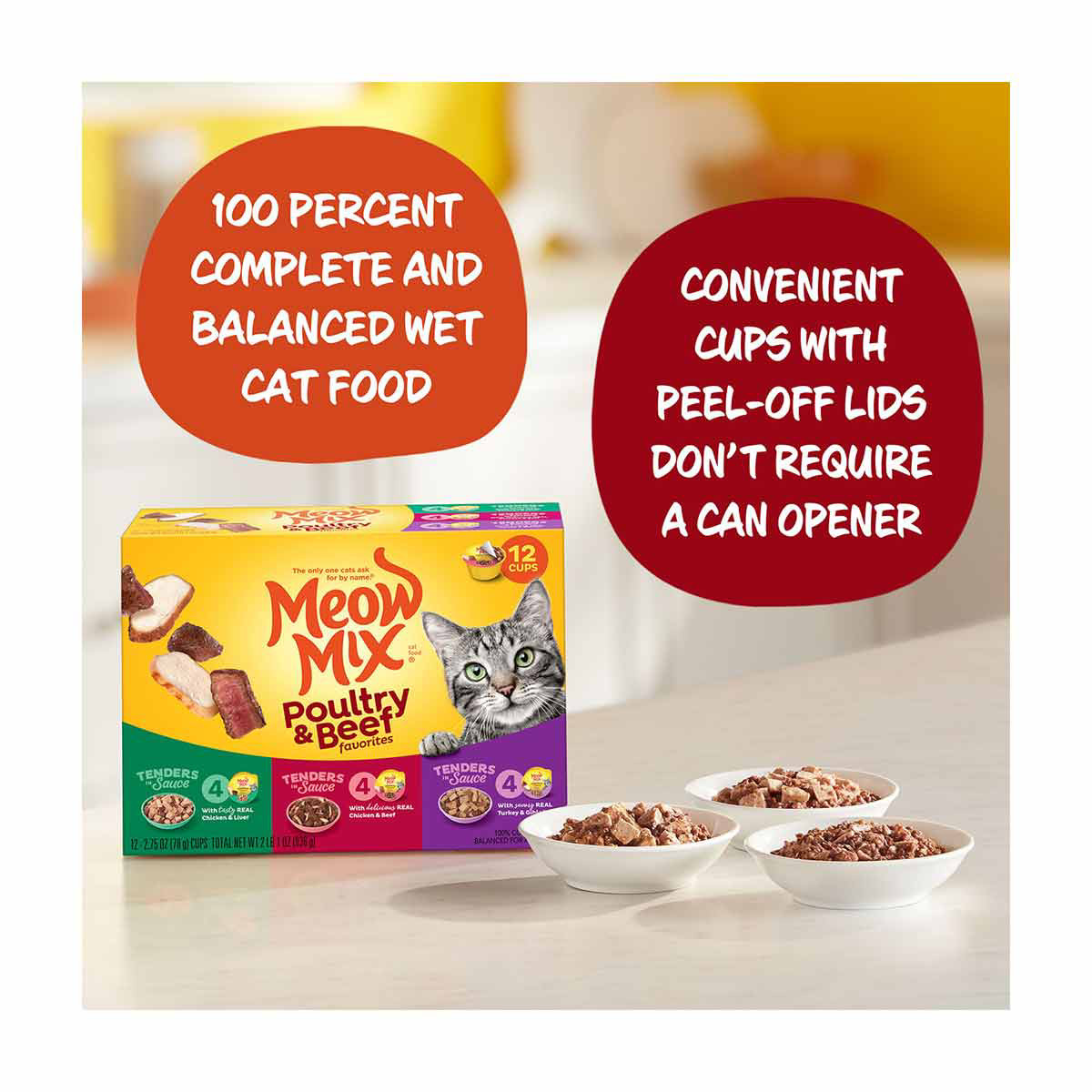 - Contains 12 cups total (2.75 oz. each) of Meow Mix Tenders in Sauce wet cat food in three (3) flavors
