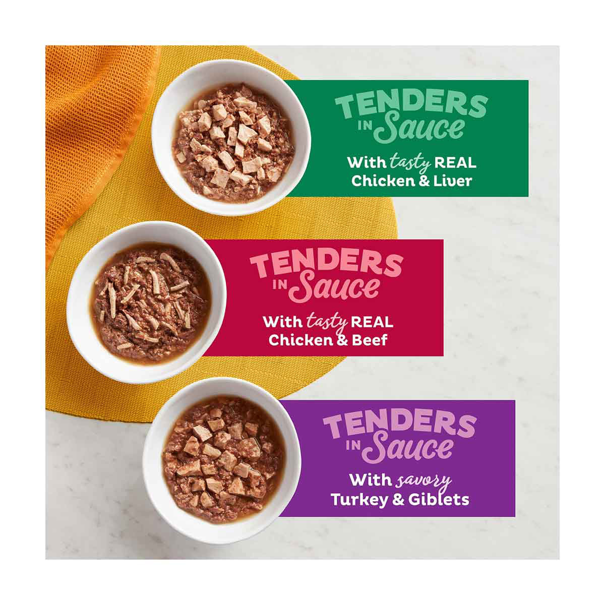 - Four (4) cups of Tenders in Sauce With Real Chicken & Liver, four (4) cups of Tenders in Sauce With Real Chicken & Beef, and four (4) cups of Tenders in Sauce With Real Turkey & Giblets