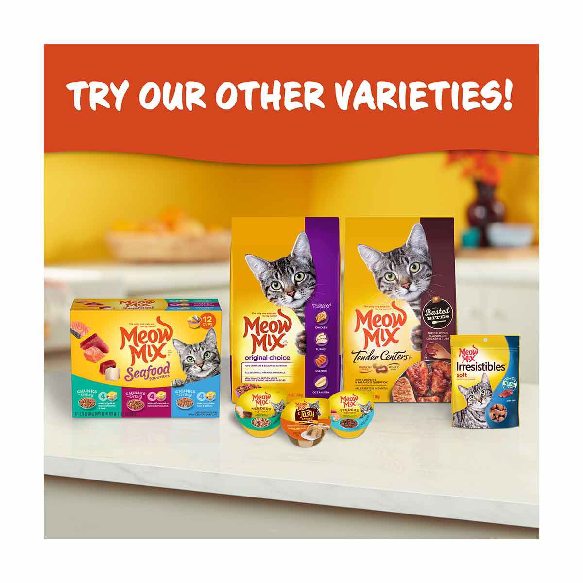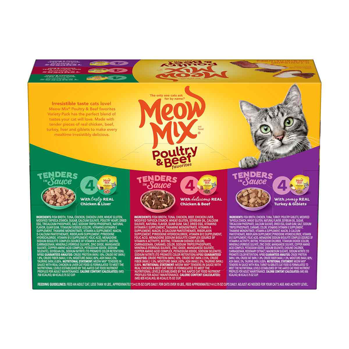 - Made with tender pieces of real chicken, beef, turkey, liver or giblets in a savory sauce, previously known as Meow Mix Tender Favorites