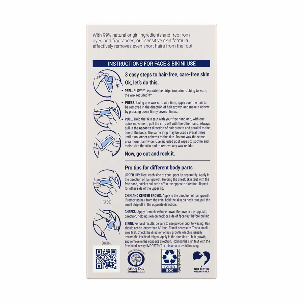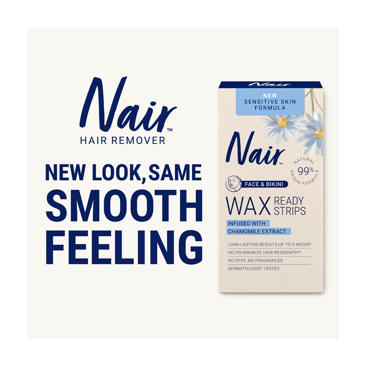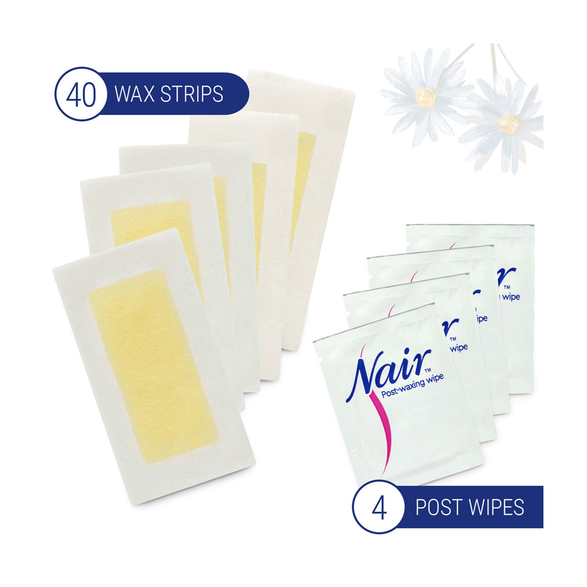 - One 40-count box of Nair Sensitive Hair Remover Wax Ready Strips, Face and Bikini Hair Removal Wax Strips with 40 hair remover wax strips and four post wax packets