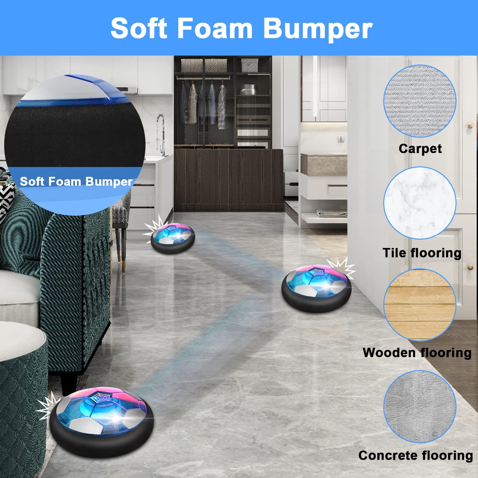 - ⚽🥅【𝐒𝐚𝐟𝐞𝐭𝐲 𝐒𝐨𝐟𝐭 𝐅𝐨𝐚𝐦 𝐁𝐮𝐦𝐩𝐞𝐫】: The hover hockey soccer set is made of non-toxic and safe materials, no odor, no fading, and no harm to kids! The edge of the hover ball is equipped with a foam buffer layer and soft foam pads on the edge, which can protect the safety of children and your walls or furniture from bumps, scratches or marks. It is very suitable for children or pets to play.
