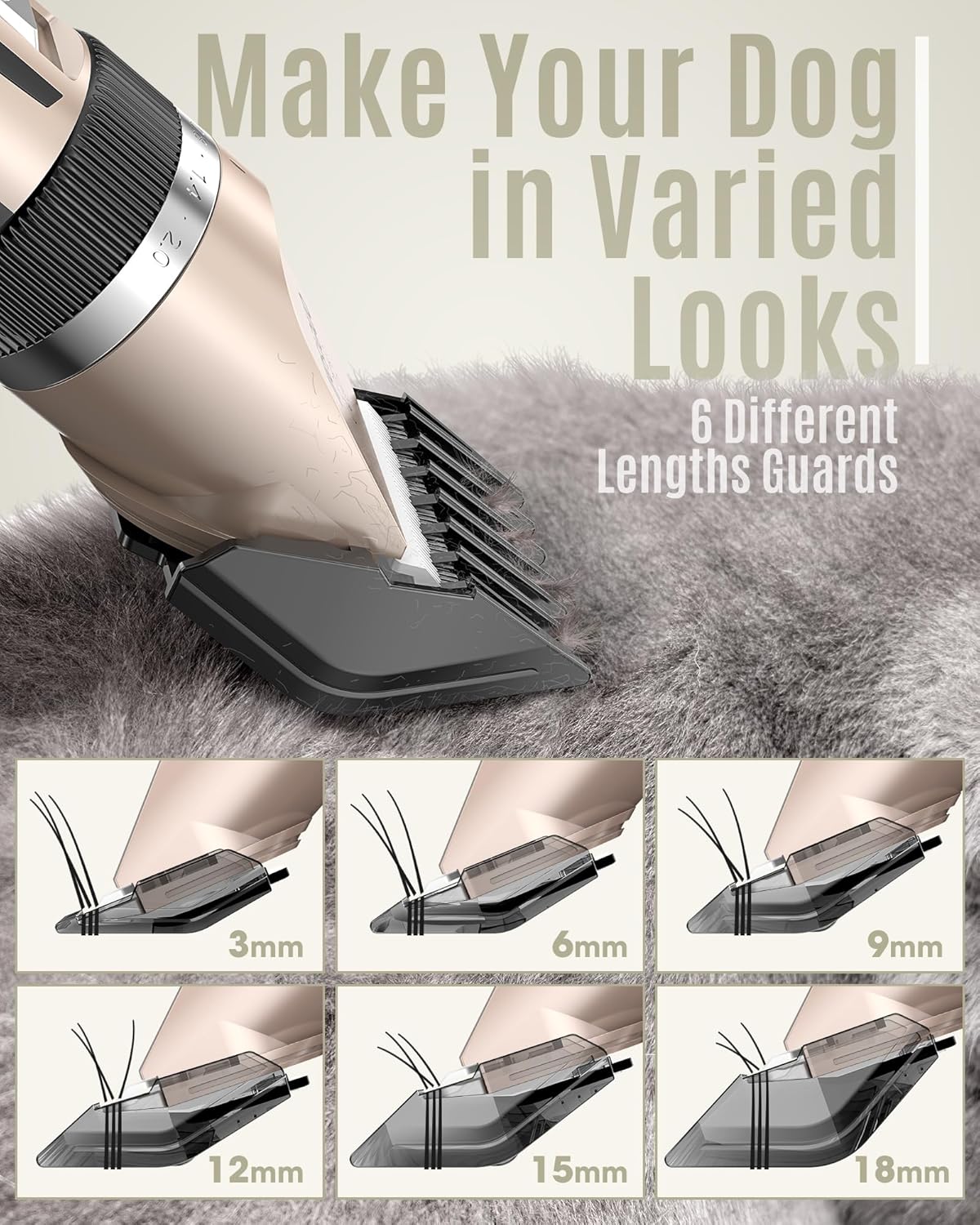 - Designed for Beginners: It comes with 6 guide combs(3/6/9/12/15/18mm) and a charger that allows for use while charging. With a one-touch start-up in just 1 second. Quick to master, show off your pet's fresh new look to the neighbors—crafted by you!