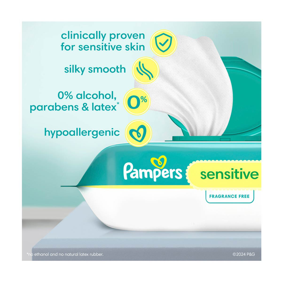 - FREE OF: Pampers Sensitive baby wipes are gentle, hypoallergenic, unscented, 0% alcohol, fragrance, parabens and latex* (*No rubbing alcohol and no natural rubber latex)