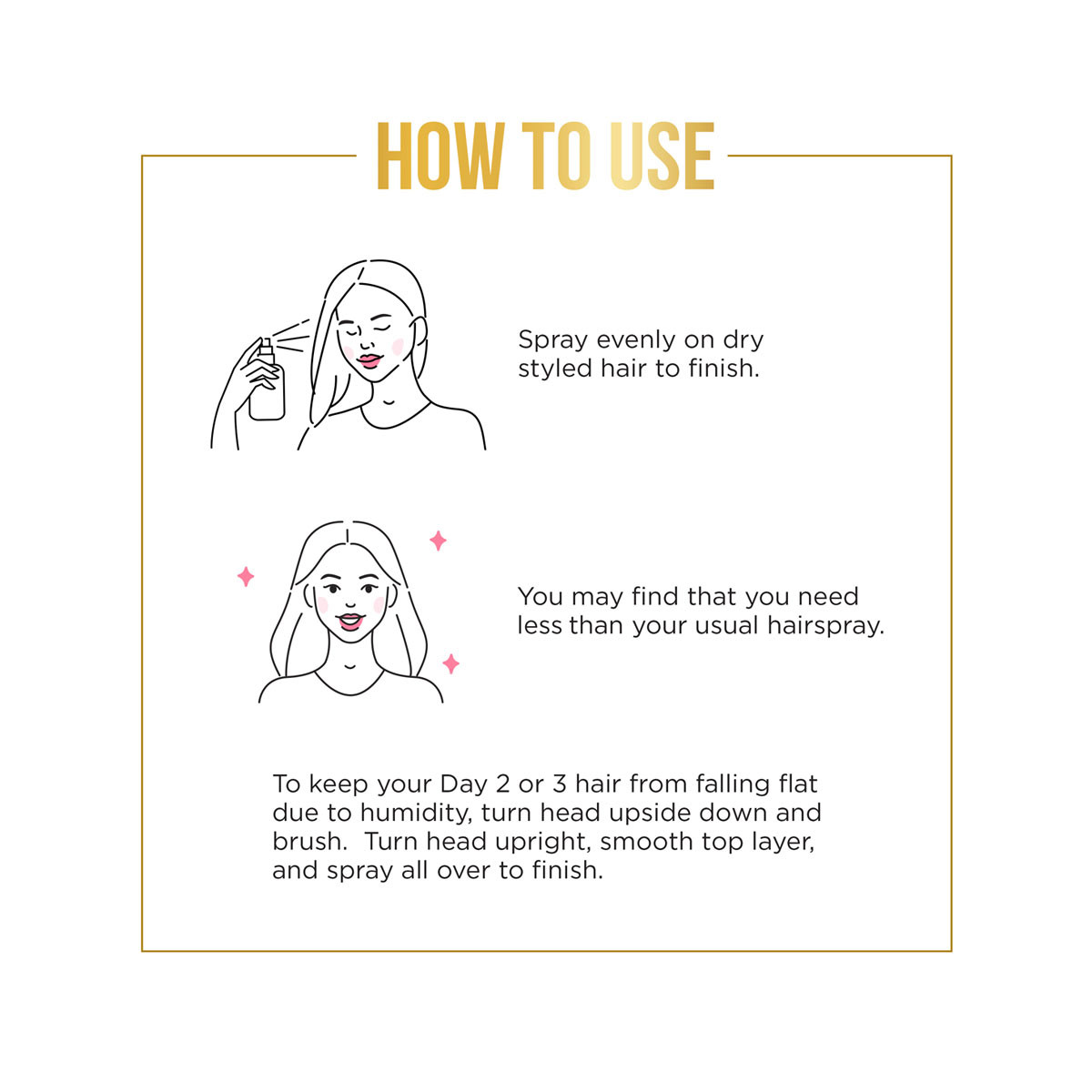 - RESTYLE YOUR STYLE brush hair upside down, flip upright, smooth top layer, and spray all over to keep day 2 or 3 hair from falling flat