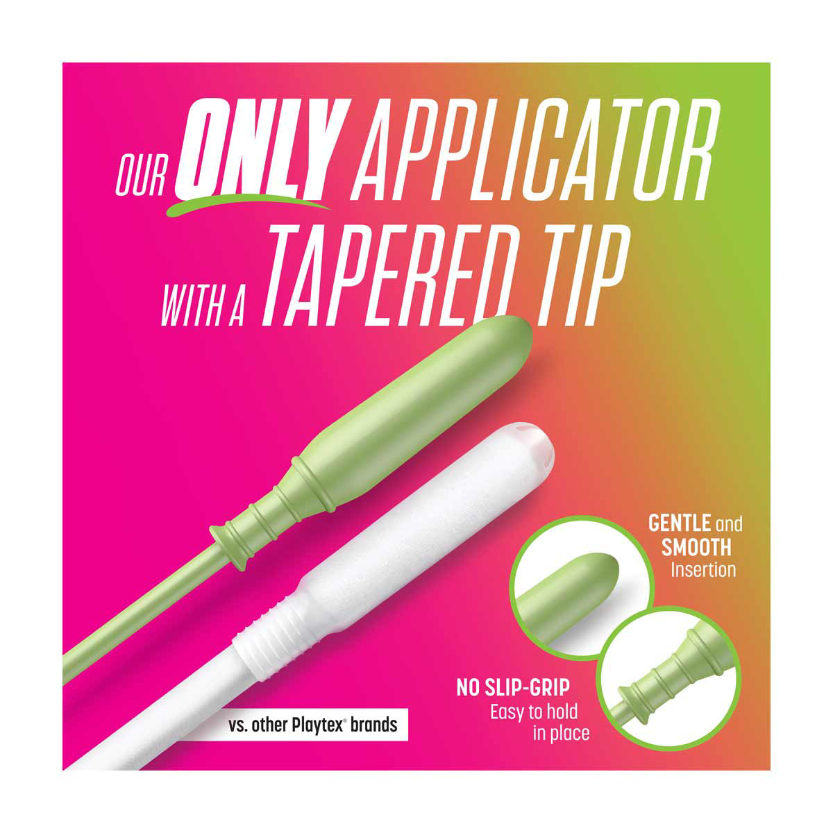 • Playtex Sport tampons feature the ONLY applicator with a tapered tip and a NO-SLIP GRIP for gentle, smooth insertion
