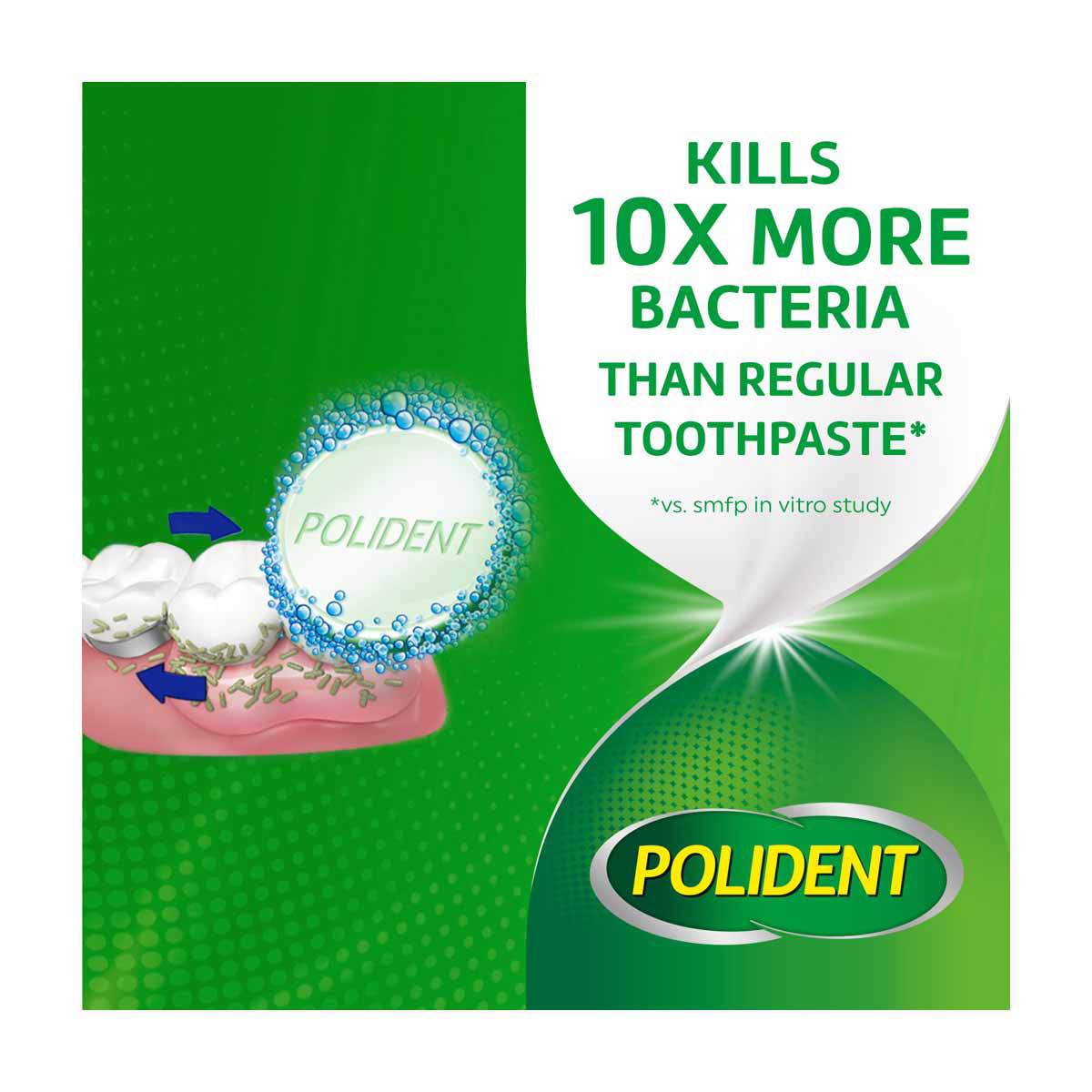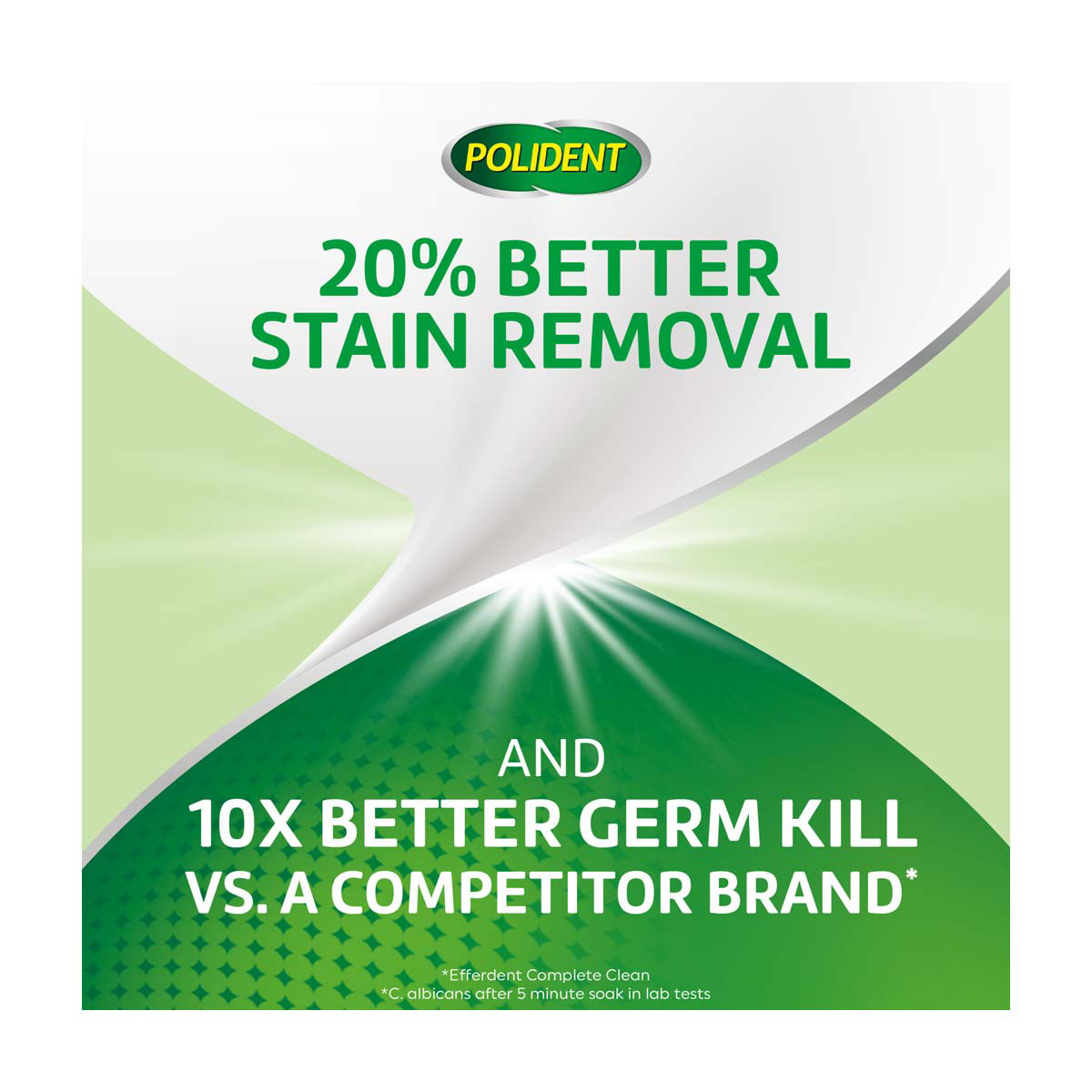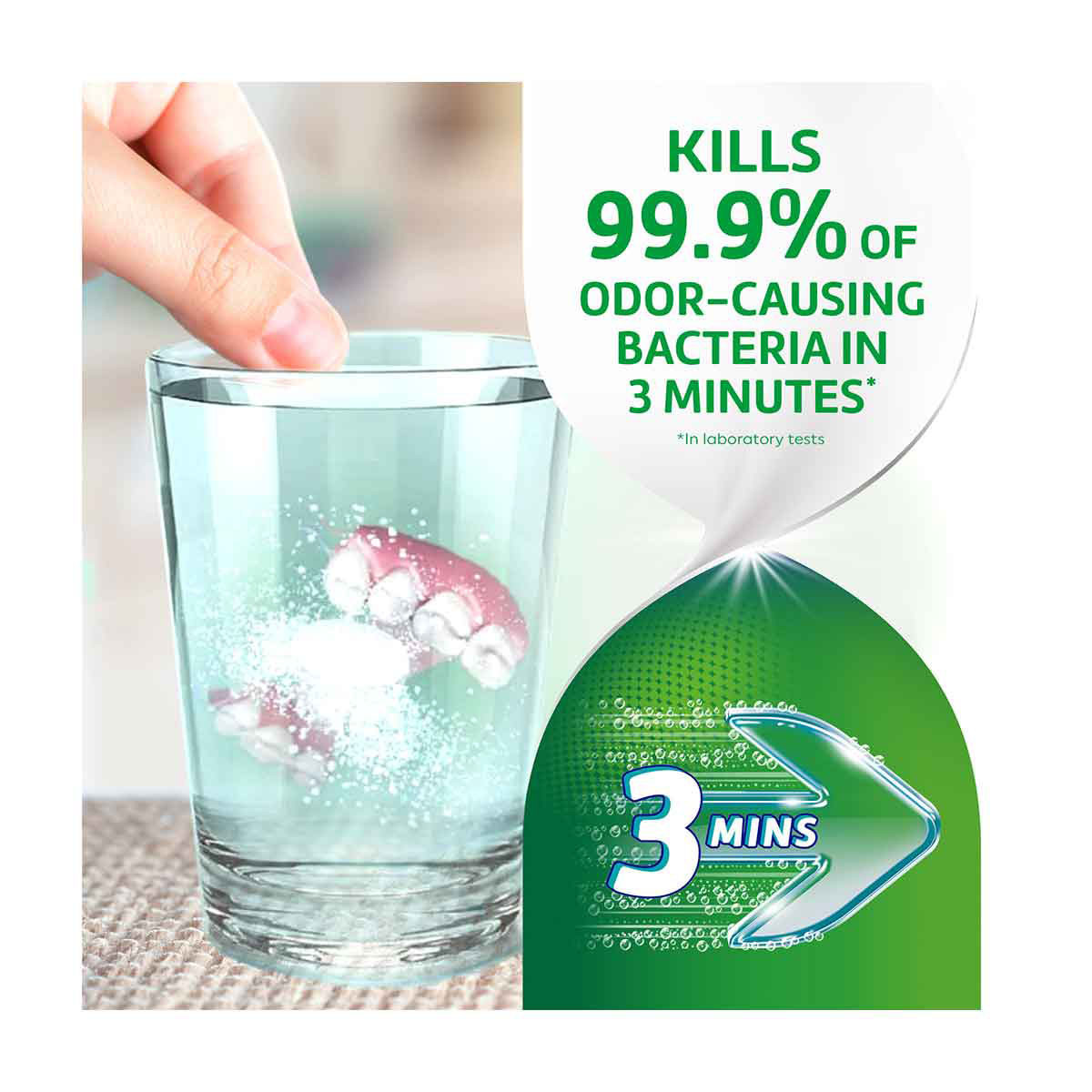 - Denture and removable oral appliance (1) cleaner tablets kills 99.99% of odor-causing bacteria (2) and viruses (3) in just 3 minutes (2) and kills 10 times more odor causing bacteria than regular toothpaste (4)