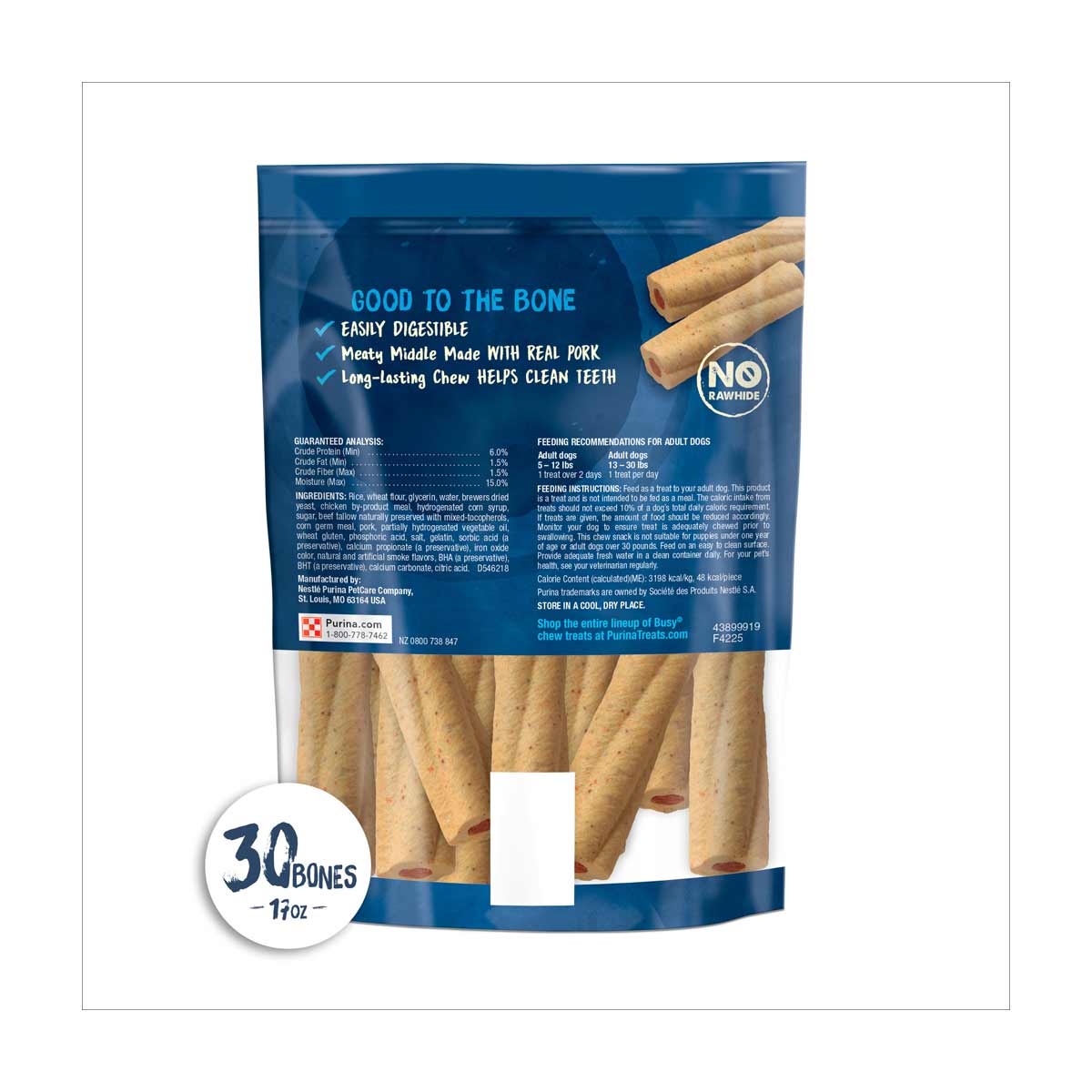 - Keep your tiniest of tiny dogs entertained with Purina Busy Bone tiny adult dog chew treats. Made with real meat in the center, these chewy bones let him know how much you care. Designed especially for a tiny dog's small mouth, each Purina Busy Bone tiny adult dog chew treat has a unique twisted shape to add to your dog's chewing pleasure. Watch his excitement as he gnaws to his heart's content, savoring the exterior as long as possible before reaching the bold, meaty reward in the center. Since these treats are made without FD and C colors, you can rest assured he's getting only the best. Help him occupy his time and satisfy his need to chew when you need to get work done, or give him a Purina Busy Bone tiny adult dog chew treat as a special reward. Made without rawhide, these treats encourage your dog to chew, which helps keep his teeth clean. Despite his tiny size, your dog is a big part of your life. Let him know how important he is by relieving his boredom and keeping him busy when you can't by offering him one of these tempting dog treats on a regular basis.